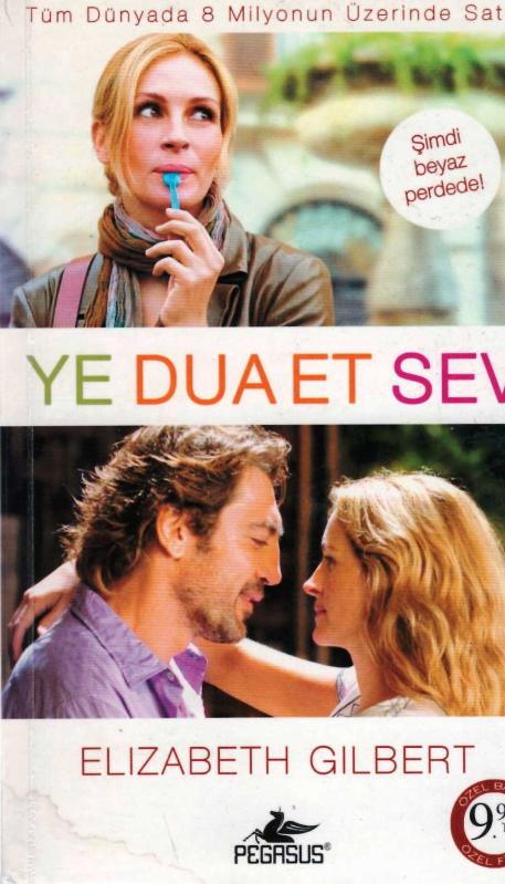 YE DUA ET SEV, ELIZABETH GILBERT tarafından kaleme alınmıştır. Kitap 2010 yılında PEGASUS tarafından [İST.] yayınlanmıştır. Bu baskının çevirisi GAMZE BULUT, ZEYNEP KUMRULUOĞLU tarafından yapılmıştır. 500 sayfadır. YE DUA ET SEV adlı eser Türkçe dilindedir.