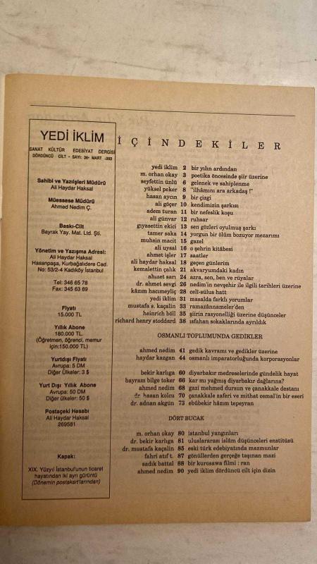 YEDİ İKLİM, SANAT, KÜLTÜR, EDEBİYAT DERGİSİ - MART 1993 SAYI: 36 CİLT: 4 M. ORHAN OKAY - SEYFETTİN ÜNLÜ - YÜKSEL PEKER - HASAN AYCIN - ALİ GÖÇER - ADEM TURAN - ALİ GÜNVAR - GİYASETTİN EKİCİ - TAMER SAKA - MUHSİN MACİT - ALİ UYSAL - AHMET İŞLER - ALİ HAYDAR HAKSAL - KEMALETTİN ÇALIK - AHMET SARI - AHMET SEVGİ - KAZIM HACIMEYLİÇ - MUSTAFA S. KAÇALİN - HEINRICH BÖLL - RICHARD H. STODDARD - AHMET NEDİM - HAYDAR KAZGAN - BEKİR KARLIGA - BAYRAM BİLGE TOKER - HASAN KOLCU - ADNAN AKGÜN - FAHRİ ATIF T. - SADIK BATTAL OSMANLI TOPLUMUNDA GEDİKLER - BİR YILIN ARDINDAN - POETİKA ÖNCESİNDE ŞİİR ÜZERİNE - BİR ÇİZGİ - KENDİMİZİN ŞARKISI - BİR NEFESLİK KOŞU - RUHSAR - SEN GÖZLERİ OYULMUŞ ŞARKI - YORGUN BİR ÖLÜM - GAZEL - O ŞEHRİN KİTÂBESİ - GEÇEN GÜNLERİM - AKVARYUMDAKİ KADIN - AZRA, SEN, BEN VE RÜYALAR - NEDİM’İN NEVŞEHİR TARİHLERİ - CELİ-SÜLUS HATT - MASALDA FARKLI YORUMLAR - RAMAZÂNNAMELER - ŞİİRİN RASYONELLİĞİ - İSFAHAN SOKAKLARINDA AYRILDIK - GEDİK KAVRAMI VE GEDİKL- TAM TAKIM EKSİKSİZ 112 SAYFA adlı eser, Kitap > Süreli Yayınlar > Dergiler > Otomobil kategorisinde İkinci El olarak satıştadır.