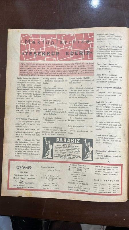 YELPAZE RESİMLİ SALON Mecmuası DERGİSİ - SAYI : 351 - 4 MART 1959 -MUSTAFA KEMAL ATATÜRK - EMİN KALAFAT - SAFA ÖNAL - ALAEDDİN KIRAL - MUKADDER KIRAL - TÜLAY YASAKÇILAR - ESEN TUNCAY - NARING SİRMEN - OĞUZ ÇETİNOĞLU - SEVİM ŞAN - SEVGİ ÇAĞLAR - IZZET AYGÜN - AYDAN SÜER - YÜKSEL GÜLGÖR - GÜNER KÖMÜRCÜ - RECEP AK - ŞEFİK KESİKPARMAK - SEYHAN DAL - HARPUTLU BABA ZİHNİ - FATİH - ÖMER PAZİ - MİNE EBİNG - MESUT GÜNGÖREN - ARAL MİL - İBRAHİM ARSLAN ATATÜRK ANITI - SİRKTE FİLLERİN KAÇIŞI - YELPAZE MECMUASI - POSTACI SÜTUNU - YAZISIZ ŞİİRLER - SAVAŞ ÖNCESİ VE SONRASI - AĞIR CEZA MAHKEMESİ - ÇARŞAMBA GÜNLERİ MECMUASI - PARASIZ MEKTUPLA İNGİLİZCE DERSLERİ - LONDRA UÇAK KAZASI - VAZİFE ŞEHİTLERİ MERASİMİ - KARIN GELİŞİ VE KIŞIN NEŞESİ - İNTERNATIONAL OFFICE GALATASARAY - SİYAH KANAT METAFORU - GİZLİ GÖZLEM VE PENCERE SAHNESİ - İŞ ADAMININ UÇAK MACERASI - GANGSTERLERİN BAR SOHBETİ - FRANK SINATRA - DEAN MARTIN - PAUL ANKA - JULIE LONDON - GERRY MULLIGAN - CHET BAKER - BILL HALLEY - LIT - 28 SAYFA adlı eser, Kitap > Süreli Yayınlar > Dergiler > Magazin, Moda kategorisinde İkinci El olarak satıştadır.