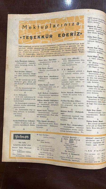 YELPAZE RESİMLİ SALON Mecmuası DERGİSİ - SAYI : 368 - 1 EMMUZ 1959 -MELEK UĞURLU – SELÇUK – A. J. CRONIN – ŞERİF METİN – PARKAS IMRE – HÜLYA KAYACAN – AYTAÇ AKBAY – BOZKURT ERGENEKO – HALİSE SAI – SENEL SEVİN – NESRİN BALABAN – GÜL SÖZMEN – HATİCE KALAYCIOĞLU – SEYHAN TAVUKÇU – JALE KURUCU – AYLA ÖZVEREN – AYHAN IŞIK – POLA MORELLI – ABDURRAHMAN RALAY – MUHTEREM NU – MUZAFFER TEMA – JOAN FONTAINE – SAİME BE – ÇOLPAN İLHAN – KENAN PARS – GÜLİSTAN GÜZEY – PERVİN PAR – ÖZTÜRK SERENGİL – MİNE COŞKUN – ERDOĞAN OKER – NEŞE YULAÇ - ŞAIKA KARADENİZ – NURİ SEVENLER – G. G. – SEVİM DEMİRKIRAN – GÜNER ŞEKER – LÂLE NARİN – ZEKİYE KOBAL – SABİHA KAMAR – AYDİL BOZKURT – ŞÜKRAN AKSAKAL – NECATİ AYDIN – TÜLİN AŞANSÜ – SEVİM ATAY – P. E. – SEVİM AKSÖYEK – FERİDUN KARAKAŞ – MEHMET KURTAR – ZÜMRÜT ÖZER – DİNMEZ ER – YILDIZ ÖNCÜ – NERMİN ÖNAL – NURSEL BİLGİLİ – EMSİLE AKKOYUN – MUHSİN TOPRAK – NURTEN ÇINAR – NAHİT ERUZ – NURTEN ŞENLER - 28 SAYFA adlı eser, Kitap > Süreli Yayınlar > Dergiler > Magazin, Moda kategorisinde İkinci El olarak satıştadır.