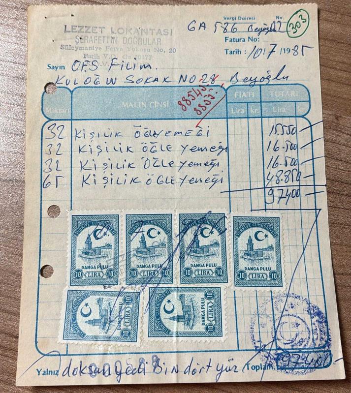 YEMEK FATURASI - 10 TEMMUZ 1985 - LEZZET LOKANTASI - ŞERAFETTİN DOĞRULAR - İSTANBUL - OSMAN FAHİR SEDEN, O.F.S. PRODÜKSİYON - BEYOĞLU, İSTANBUL - ISLAK İMZALI, KAŞELİ DAMGA PULU - 13 x 17 cm EBATLI ORİJİNAL FATURA - TÜRK SİNEMA - FİLM TARİHİ, 11 ay önce satışa sunulmuştur.
