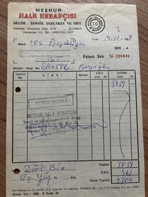 YEMEK FATURASI - 14 OCAK 1987 - MEŞHUR HALK KEBAPÇISI - İSTANBUL - OSMAN FAHİR SEDEN, O.F.S. PRODÜKSİYON - BEYOĞLU, İSTANBUL - ISLAK İMZALI, KAŞELİ - 13 x 19 cm EBATLI ORİJİNAL FATURA - TÜRK SİNEMA - FİLM TARİHİ, en son 1 yıl önce güncellenmiştir.