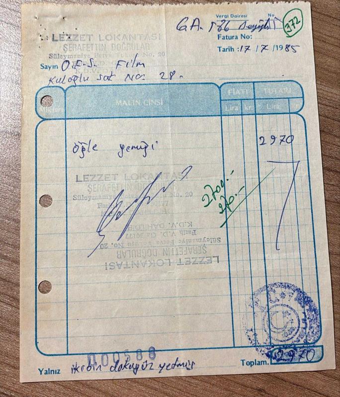 YEMEK FATURASI - 17 TEMMUZ 1985 - LEZZET LOKANTASI - ŞERAFETTİN DOĞRULAR - İSTANBUL - OSMAN FAHİR SEDEN, O.F.S. PRODÜKSİYON - BEYOĞLU, İSTANBUL - ISLAK İMZALI, KAŞELİ DAMGA PULU - 13 x 17 cm EBATLI ORİJİNAL FATURA - TÜRK SİNEMA - FİLM TARİHİ, 11 ay önce satışa sunulmuştur.