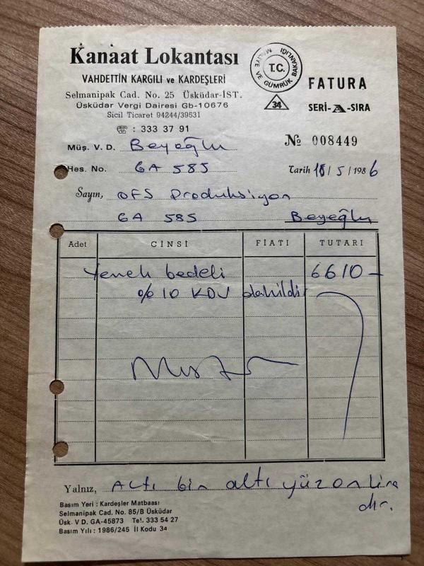 YEMEK FATURASI - 18 MAYIS 1986 - KANAAT LOKANTASI - VAHDETTİN KARGILI VE KARDEŞLERİ - ÜSKÜDAR, İSTANBUL - OSMAN FAHİR SEDEN, O.F.S. PRODÜKSİYON - BEYOĞLU, İSTANBUL - ISLAK İMZALI, KAŞELİ - 14 x 20 cm EBATLI ORİJİNAL FATURA - TÜRK SİNEMA - FİLM TARİHİ, 1 yıl önce satışa sunulmuştur.