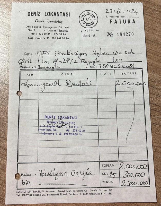 YEMEK FATURASI - 23 EKİM 1994 - DENİZ LOKANTASI - ÖMER DEMİRTAŞ - 4.LEVENT, İSTANBUL - OSMAN FAHİR SEDEN, O.F.S. PRODÜKSİYON - BEYOĞLU, İSTANBUL - ISLAK İMZALI, KAŞELİ - 13 x 19 cm EBATLI ORİJİNAL FATURA - TÜRK SİNEMA - FİLM TARİHİ, en son 1 yıl önce güncellenmiştir.