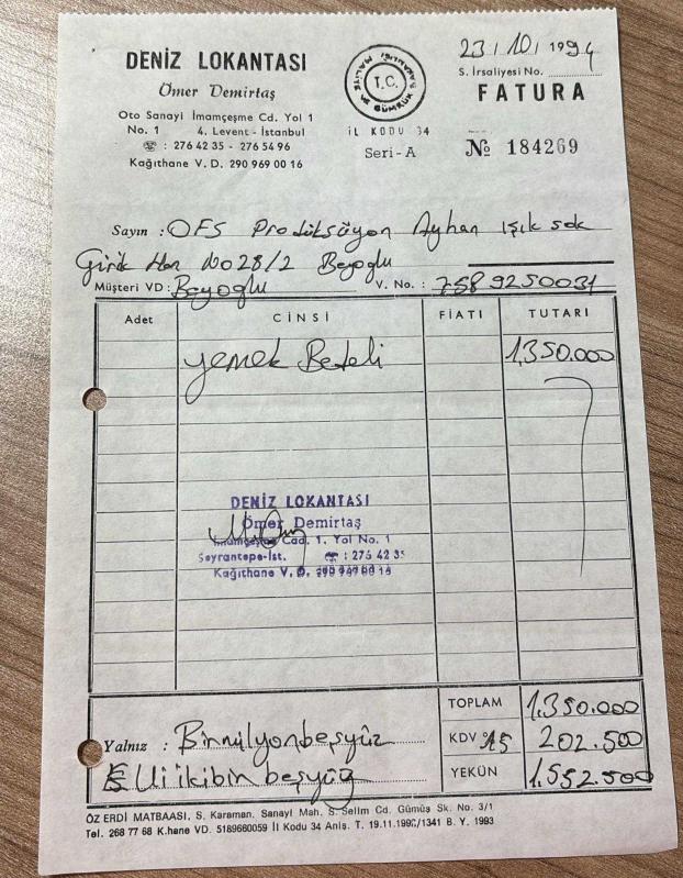 YEMEK FATURASI - 23 EKİM 1994 - DENİZ LOKANTASI - ÖMER DEMİRTAŞ - 4.LEVENT, İSTANBUL - OSMAN FAHİR SEDEN, O.F.S. PRODÜKSİYON - BEYOĞLU, İSTANBUL - ISLAK İMZALI, KAŞELİ - 13 x 19 cm EBATLI ORİJİNAL FATURA - TÜRK SİNEMA - FİLM TARİHİ