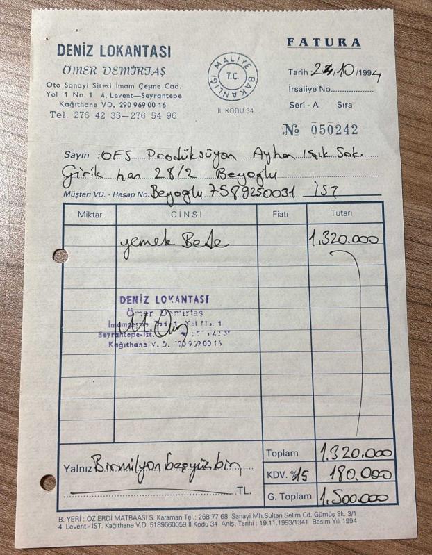 YEMEK FATURASI - 24 EKİM 1994 - DENİZ LOKANTASI - ÖMER DEMİRTAŞ - 4.LEVENT, İSTANBUL - OSMAN FAHİR SEDEN, O.F.S. PRODÜKSİYON - BEYOĞLU, İSTANBUL - ISLAK İMZALI, KAŞELİ - 13 x 19 cm EBATLI ORİJİNAL FATURA - TÜRK SİNEMA - FİLM TARİHİ