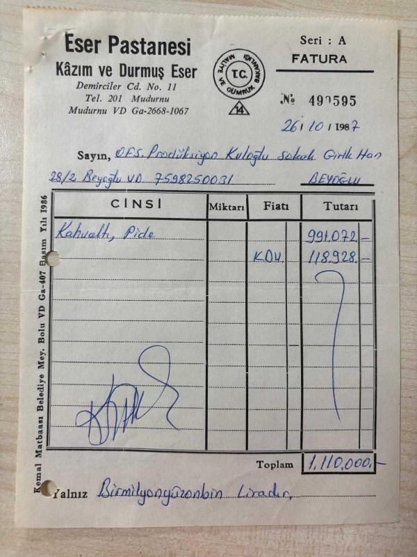 YEMEK FATURASI - 26 EKİM 1987 - ESER PASTANESİ - KAZIM VE DURMUŞ ESER - MUDURNU, BOLU - OSMAN FAHİR SEDEN - O.F.S PRODÜKSİYON - BEYOĞLU, İSTANBUL - ISLAK İMZALI, KAŞELİ - 14 x 20 cm EBATLI ORİJİNAL FATURA, en son 1 yıl önce güncellenmiştir.