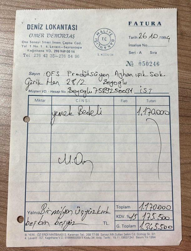 YEMEK FATURASI - 26 EKİM 1994 - DENİZ LOKANTASI - ÖMER DEMİRTAŞ - 4.LEVENT, İSTANBUL - OSMAN FAHİR SEDEN, O.F.S. PRODÜKSİYON - BEYOĞLU, İSTANBUL - ISLAK İMZALI, KAŞELİ - 13 x 19 cm EBATLI ORİJİNAL FATURA - TÜRK SİNEMA - FİLM TARİHİ