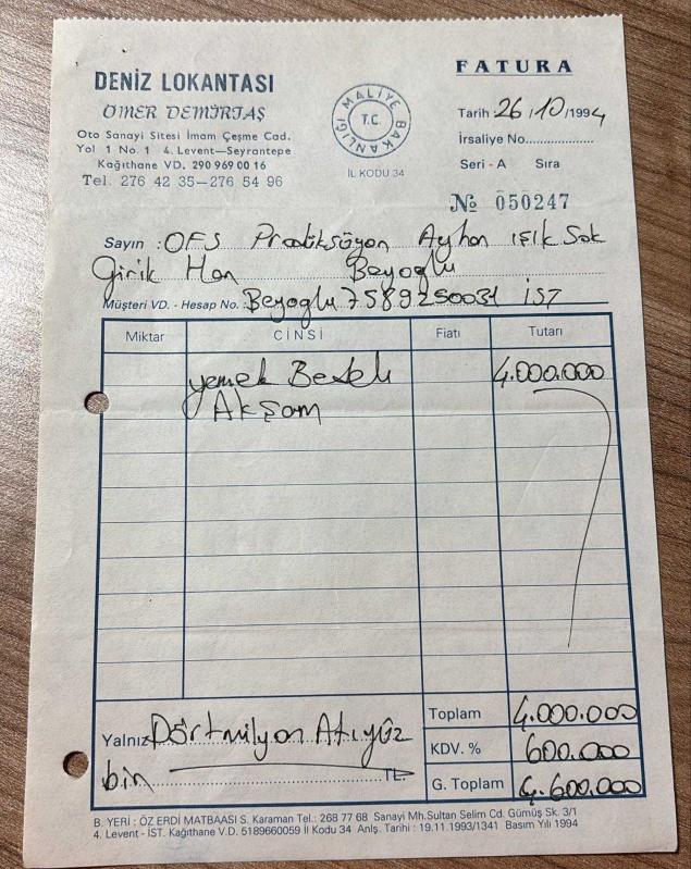 YEMEK FATURASI - 26 EKİM 1994 - DENİZ LOKANTASI - ÖMER DEMİRTAŞ - 4.LEVENT, İSTANBUL - OSMAN FAHİR SEDEN, O.F.S. PRODÜKSİYON - BEYOĞLU, İSTANBUL - ISLAK İMZALI, KAŞELİ - 13 x 19 cm EBATLI ORİJİNAL FATURA - TÜRK SİNEMA - FİLM TARİHİ, en son 1 yıl önce güncellenmiştir.