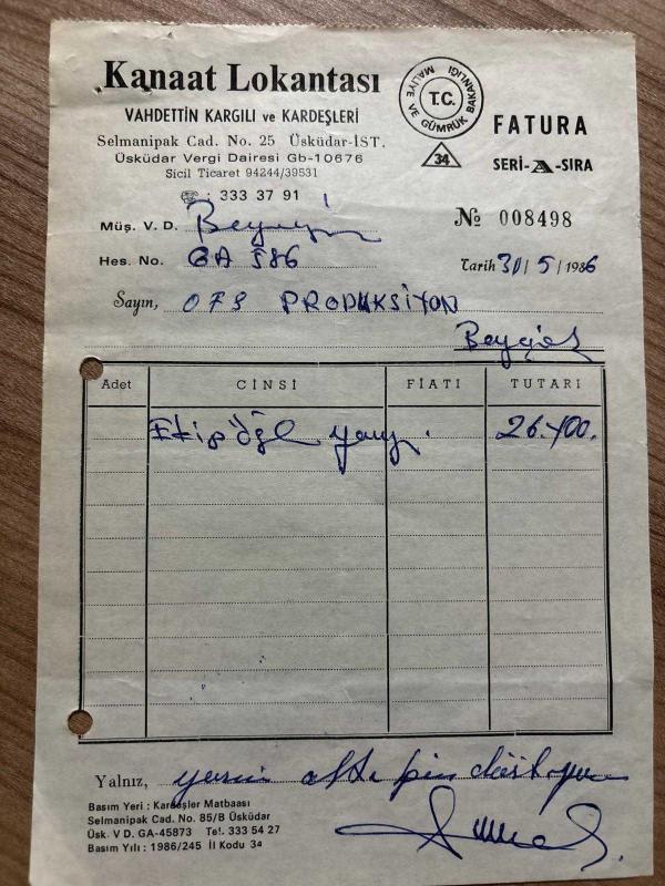 YEMEK FATURASI - 30 MAYIS 1986 - KANAAT LOKANTASI - VAHDETTİN KARGILI VE KARDEŞLERİ - ÜSKÜDAR, İSTANBUL - OSMAN FAHİR SEDEN, O.F.S. PRODÜKSİYON - BEYOĞLU, İSTANBUL - ISLAK İMZALI, KAŞELİ - 14 x 20 cm EBATLI ORİJİNAL FATURA - TÜRK SİNEMA - FİLM TARİHİ, 1 yıl önce satışa sunulmuştur.