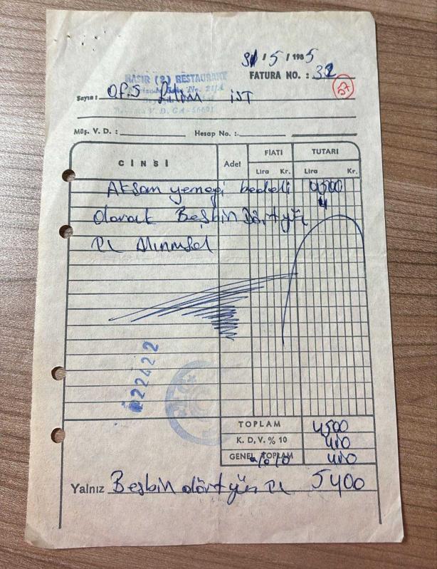 YEMEK FATURASI - 31 MAYIS 1985 - HASIR 2 RESTAURANT - BEYOĞLU, İSTANBUL - OSMAN FAHİR SEDEN, O.F.S. PRODÜKSİYON - BEYOĞLU, İSTANBUL - ISLAK İMZALI, KAŞELİ - 13 x 19 cm EBATLI ORİJİNAL FATURA - TÜRK SİNEMA - FİLM TARİHİ, en son 1 yıl önce güncellenmiştir.