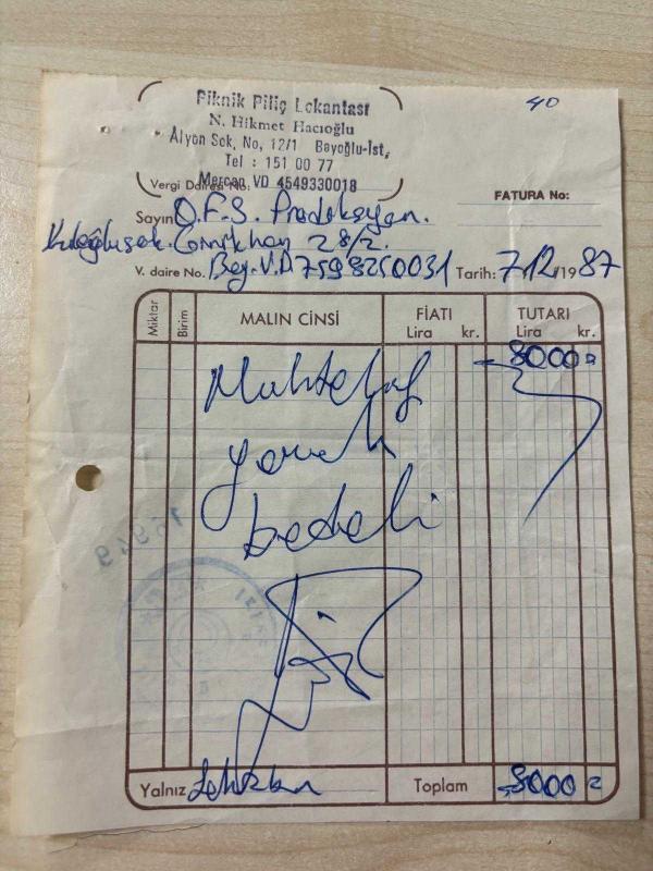 YEMEK FATURASI - 7 ARALIK 1987 - PİKNİK PİLİÇ LOKANTASI - N.HİKMET HACIOĞLU - BEYOĞLU, İSTANBUL - OSMAN F. SEDEN - BEYOĞLU, İSTANBUL - ISLAK İMZALI, KAŞELİ - 13 x 16 cm EBATLI ORİJİNAL FATURA, en son 1 yıl önce güncellenmiştir.