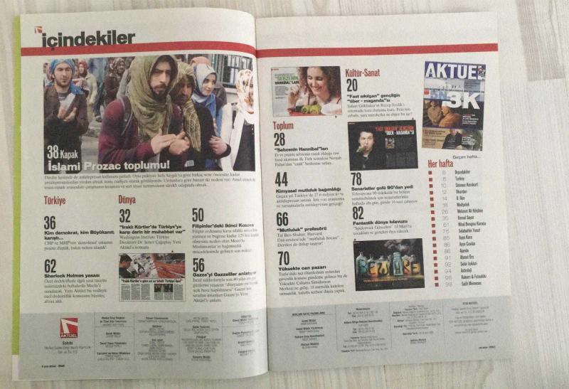 YENİ AKTÜEL HAFTALIK HABER DERGİSİ - SAYI 140 - 13/19 MART 2008 RECEP İVEDİK: “FAST SIKILGAN” GENÇLİĞİN “ÜBER-MAGANDA”SI - DİNDAR KESİMDE ANTİDEPRESAN PATLADI: İSLAMİ PROZAC TOPLUMU - KÜRT SORUNUNDA AKP VE ORDU EL ELE - CHP VE MHP’NİN DEMOKRASİ ÇIKIŞI: KİM DEMOKRAT, KİM DERİN? - IRAKLI KÜRTLER’DE TÜRKİYE’YE DERİN MUHABBET - GAZZE’Yİ GAZZELİLER ANLATIYOR: AÇIK HAVA HAPİSHANESİ - MORO MÜSLÜMANLARI: FİLİPİNLER’DE İKİNCİ KOSOVA - ÖZEL DEDEKTİFLER İÇİN “SHERLOCK HOLMES” YASASI GELİYOR - SEBZECİ HANNIBALLAR: RAW FOOD AKIMI VE “CANLI BESİN” MODASI - TUZLA’DA YÜKSEKTE CAN PAZARI: 3 METREDEN %85 ÖLÜM - KİMYASAL MUTLULUK BAĞIMLILIĞI: 27.6 MİLYON KUTU ANTİDEPRESAN - SENARİSTLER HAFTADA 6 GÜN, GÜNDE 16 SAAT ÇALIŞIYOR - ŞAHAN GÖKBAKAR - SEFA SAYGILI - ÖMER LAÇİNER - SONER ÇAĞATAY - MEHMET ALİ KILIÇBAY - KEMAL SAYAR - NIHAL BENGİSU KARACA - SELAHATTİN YUSUF - AYŞE KORA - AYŞE ÇAVDAR - AHMET ORS - SALİH MEMECAN - PERİHAN MAGDEN - SÖNMEZ KARAKURT - ÇAĞLA KALAFAT - CANAN DİLA - SERHAT GURPINAR98 SAYFA, Ercan Arıklı tarafından kaleme alınmıştır. Eser Önay Bilgin editörlüğünde hazırlanmıştır. Kitap 1 Numara Hearst Yayıncılık tarafından yayınlanmıştır. 98 sayfadır. YENİ AKTÜEL HAFTALIK HABER DERGİSİ - SAYI 140 - 13/19 MART 2008 RECEP İVEDİK: “FAST SIKILGAN” GENÇLİĞİN “ÜBER-MAGANDA”SI - DİNDAR KESİMDE ANTİDEPRESAN PATLADI: İSLAMİ PROZAC TOPLUMU - KÜRT SORUNUNDA AKP VE ORDU EL ELE - CHP VE MHP’NİN DEMOKRASİ ÇIKIŞI: KİM DEMOKRAT, KİM DERİN? - IRAKLI KÜRTLER’DE TÜRKİYE’YE DERİN MUHABBET - GAZZE’Yİ GAZZELİLER ANLATIYOR: AÇIK HAVA HAPİSHANESİ - MORO MÜSLÜMANLARI: FİLİPİNLER’DE İKİNCİ KOSOVA - ÖZEL DEDEKTİFLER İÇİN “SHERLOCK HOLMES” YASASI GELİYOR - SEBZECİ HANNIBALLAR: RAW FOOD AKIMI VE “CANLI BESİN” MODASI - TUZLA’DA YÜKSEKTE CAN PAZARI: 3 METREDEN %85 ÖLÜM - KİMYASAL MUTLULUK BAĞIMLILIĞI: 27.6 MİLYON KUTU ANTİDEPRESAN - SENARİSTLER HAFTADA 6 GÜN, GÜNDE 16 SAAT ÇALIŞIYOR - ŞAHAN GÖKBAKAR - SEFA SAYGILI - ÖMER LAÇİNER - SONER ÇAĞATAY - MEHMET ALİ KILIÇBAY - KEMAL SAYAR - NIHAL BENGİSU KARACA - SELAHATTİN YUSUF - AYŞE KORA - AYŞE ÇAVDAR - AHMET ORS - SALİH MEMECAN - PERİHAN MAGDEN - SÖNMEZ KARAKURT - ÇAĞLA KALAFAT - CANAN DİLA - SERHAT GURPINAR98 SAYFA adlı eser Türkçe dilindedir.