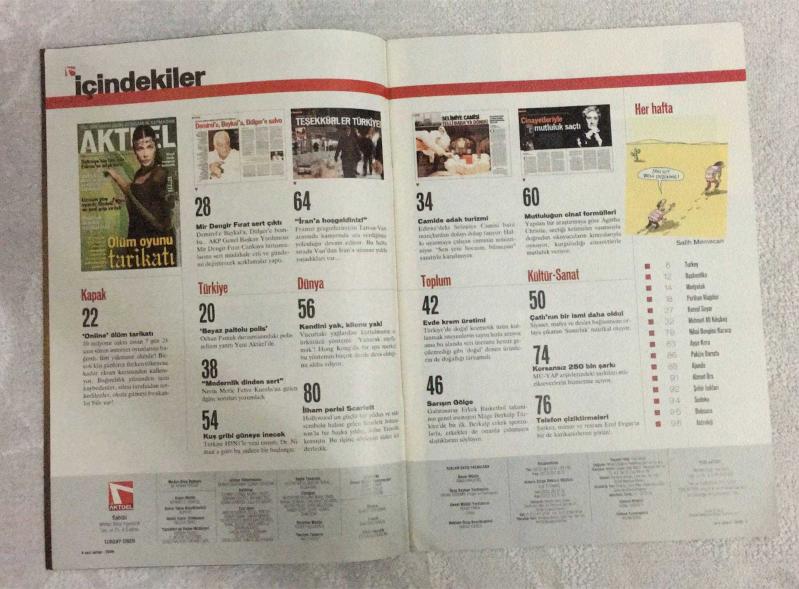 YENİ AKTÜEL HAFTALIK HABER DERGİSİ - SAYI:27 - 2006 - 17-23 OCAK - 250 BİN ŞARKI SİZİN: KORSANLIK YAPMADAN – SELİMİYE'NİN TAŞI İÇİN EDİRNE'YE ADAK TURU – ŞİMDİ MODA: EVYAPIMI KOZMETİK – AKP'Lİ FIRAT DEMİREL, BAYKAL VE DÜLGER'İ BOMBALADI – UZMANI UYARDI: SİZDEKİ EN YENİ GRİP VİRÜSÜ – SUSURLUK SKANDALI MÜZİKAL OLDU – 10 MİLYON KİŞİ SANAL OYUN BAĞIMLISI: BİRİ ÇOK YAKININIZDA OLABİLİR – ÖLÜM OYUNU TARİKATI – CİNAYETLERİYLE MUTLULUK SAÇTI – SEN GİT BEN DÜŞÜNME – BEYAZ PALTOLU POLİS: ORHAN PAMUK DURUŞMASINDA – MODERNLİK DİNDEN SERT – KUŞ GRİBİ GÜNEYE İNECEK – İRAN’A HOŞGELDİNİZ – KENDİNİ YAK, KİLONU YAK – İLHAM PERİSİ SCARLETT JOHANSSON – CAMİDE ADAK TURİZMİ – EVDE KREM ÜRETİMİ – SARIŞIN GÖLGE – MUTLULUĞUN CİNAYİ FORMÜLLERİ – ÇATLI’NIN BİR İSMİ DAHA OLDU – MO-YAP ARŞİVLERİ: KORSANSIZ 250 BİN ŞARKI – EROL EVGİN’İN KARİKATÜRLERİ – YANARAK ZAYIFLAMA YÖNTEMİ – ONLINE OYUNLAR: 7/24 EKRAN BAŞINDA YAŞAM – SCARLETT & TRAVOLTA SÖYLEŞİSİ – ASTROLOJİ – SUDOKU – BELMACA – AJANDA - MİR DENGİR 98 SAYFA, Ercan Arıklı tarafından kaleme alınmıştır. Eser Önay Bilgin editörlüğünde hazırlanmıştır. Kitap 1 Numara Hearst Yayıncılık tarafından yayınlanmıştır. 194 sayfadır. YENİ AKTÜEL HAFTALIK HABER DERGİSİ - SAYI:27 - 2006 - 17-23 OCAK - 250 BİN ŞARKI SİZİN: KORSANLIK YAPMADAN – SELİMİYE'NİN TAŞI İÇİN EDİRNE'YE ADAK TURU – ŞİMDİ MODA: EVYAPIMI KOZMETİK – AKP'Lİ FIRAT DEMİREL, BAYKAL VE DÜLGER'İ BOMBALADI – UZMANI UYARDI: SİZDEKİ EN YENİ GRİP VİRÜSÜ – SUSURLUK SKANDALI MÜZİKAL OLDU – 10 MİLYON KİŞİ SANAL OYUN BAĞIMLISI: BİRİ ÇOK YAKININIZDA OLABİLİR – ÖLÜM OYUNU TARİKATI – CİNAYETLERİYLE MUTLULUK SAÇTI – SEN GİT BEN DÜŞÜNME – BEYAZ PALTOLU POLİS: ORHAN PAMUK DURUŞMASINDA – MODERNLİK DİNDEN SERT – KUŞ GRİBİ GÜNEYE İNECEK – İRAN’A HOŞGELDİNİZ – KENDİNİ YAK, KİLONU YAK – İLHAM PERİSİ SCARLETT JOHANSSON – CAMİDE ADAK TURİZMİ – EVDE KREM ÜRETİMİ – SARIŞIN GÖLGE – MUTLULUĞUN CİNAYİ FORMÜLLERİ – ÇATLI’NIN BİR İSMİ DAHA OLDU – MO-YAP ARŞİVLERİ: KORSANSIZ 250 BİN ŞARKI – EROL EVGİN’İN KARİKATÜRLERİ – YANARAK ZAYIFLAMA YÖNTEMİ – ONLINE OYUNLAR: 7/24 EKRAN BAŞINDA YAŞAM – SCARLETT & TRAVOLTA SÖYLEŞİSİ – ASTROLOJİ – SUDOKU – BELMACA – AJANDA - MİR DENGİR 98 SAYFA adlı eser Türkçe dilindedir.