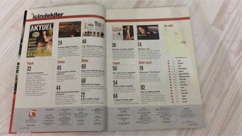 YENİ AKTÜEL HAFTALIK HABER DERGİSİ - SAYI:32 - 21-27 ŞUBAT - 2006 - GELECEĞİ GÖSTEREN MEVLANA YUMURTASI – KOMPLE VADİSİ TRABZON – PAPAZ CİNAYETİNİN İZİNDE – “KONUŞURSAM CEZAMIZ KATLANIR” – NATO BOMBARDIMANINDAN KURTULDUK – IRAK, VIETNAM’DAN PAHALI – BAŞIMIZIN ÜSTÜNDE YERİ VAR – OKYANUSTA TEK BAŞINA – SABAH YÜZÜM YOKTU – KADINLAR BU HAPI PEŞİNDE – SEN, BEN, BİR DE ÇÖPÇATAN – BABASININ KIZI – GÖRÜCÜ USULÜ EVLİLİĞE DÖNÜŞ – TUĞBA ÖZAY’IN DOĞAL VİAGRASI – 2 MİLYON TEK GÖZLÜ İÇİN EHLİYET UMUDU – EYVAH BABALAR BÜYÜDÜ – TRAFİĞE İKİ MİLYON GÖZ – AŞK ON DAKİKA GECİKTİ – “YENİ DÜNYA” SİNEMANIA – BERLİN FİLM FESTİVALİ – HOSPITALITYCLUB – SALİH MEMECAN ÇİZDİ – SUDOKU’DAN SONRA KAKURO – ASTROLOJİ – AJANDA – ŞARKI SÖYLEYEN HAYALET – HAYDAR BAŞ’IN İDEOLOJİSİ – KURTLAR VADİSİ TRABZON – POLAT ALEMDAR’IN ÇOCUKLUĞUNA BENZERLİK – HAYALET SİLAH “GLOCK” – KATİLİN IRAK EMNİYETİNE KAYITLI SİLAHI – KURTLAR VADİSİ ETKİSİ – MEVLANA – ANDREA SANTORO – LEVENT BİÇAKCI – ALİ ŞEN – ISABELLE DINOIRE – JOHNNY 98 SAYFA, Ercan Arıklı tarafından kaleme alınmıştır. Eser Önay Bilgin editörlüğünde hazırlanmıştır. Kitap 1 Numara Hearst Yayıncılık tarafından yayınlanmıştır. 98 sayfadır. YENİ AKTÜEL HAFTALIK HABER DERGİSİ - SAYI:32 - 21-27 ŞUBAT - 2006 - GELECEĞİ GÖSTEREN MEVLANA YUMURTASI – KOMPLE VADİSİ TRABZON – PAPAZ CİNAYETİNİN İZİNDE – “KONUŞURSAM CEZAMIZ KATLANIR” – NATO BOMBARDIMANINDAN KURTULDUK – IRAK, VIETNAM’DAN PAHALI – BAŞIMIZIN ÜSTÜNDE YERİ VAR – OKYANUSTA TEK BAŞINA – SABAH YÜZÜM YOKTU – KADINLAR BU HAPI PEŞİNDE – SEN, BEN, BİR DE ÇÖPÇATAN – BABASININ KIZI – GÖRÜCÜ USULÜ EVLİLİĞE DÖNÜŞ – TUĞBA ÖZAY’IN DOĞAL VİAGRASI – 2 MİLYON TEK GÖZLÜ İÇİN EHLİYET UMUDU – EYVAH BABALAR BÜYÜDÜ – TRAFİĞE İKİ MİLYON GÖZ – AŞK ON DAKİKA GECİKTİ – “YENİ DÜNYA” SİNEMANIA – BERLİN FİLM FESTİVALİ – HOSPITALITYCLUB – SALİH MEMECAN ÇİZDİ – SUDOKU’DAN SONRA KAKURO – ASTROLOJİ – AJANDA – ŞARKI SÖYLEYEN HAYALET – HAYDAR BAŞ’IN İDEOLOJİSİ – KURTLAR VADİSİ TRABZON – POLAT ALEMDAR’IN ÇOCUKLUĞUNA BENZERLİK – HAYALET SİLAH “GLOCK” – KATİLİN IRAK EMNİYETİNE KAYITLI SİLAHI – KURTLAR VADİSİ ETKİSİ – MEVLANA – ANDREA SANTORO – LEVENT BİÇAKCI – ALİ ŞEN – ISABELLE DINOIRE – JOHNNY 98 SAYFA adlı eser Türkçe dilindedir.