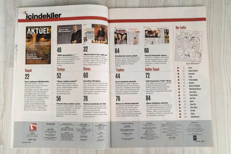 YENİ AKTÜEL HAFTALIK HABER DERGİSİ - SAYI 43 - 10 MAYIS 2005 - DA VINCI ŞİFRESİ FİLMİNİN SIRLARI VE TOM HANKS İLE ÖZEL RÖPORTAJ - SEZER, GÜÇLÜ BİR DEMOKRASİDE KOLTUĞUNU YİTİRİRDİ - HZ. İSA’NIN İSLAMİ ŞİFRELERİ - NURCULAR’A GÖRE İKİ DİNİ MÜSLÜMAN İSEVİLER CEMAATİ BİRLEŞTİRECEK - HZ. İSA’YI BEKLEYEN MÜSLÜMANLAR - İKİ CIA AJANI ANLATTI: ABD İRAN’I 9 NOKTADAN VURACAK - İSRAİL’İN İNTİHAR KÖPEKLERİ PLANDA - TANDIRDA TÖRE İNTİHARI - GENEL AF ÇIKSIN, PKK SİYASALLAŞSIN - MONA LISA’M İÇİN HALA VAKTİM VAR - İKİ AŞK ARASI HETOX - AMERİKAN HİROŞİMA: İRAN’A MUHTEMEL SALDIRI PLANI - YÜRÜME BANDINDA BİR LİDER: DALAY LAMA’NIN FOTOĞRAFÇISI ANLATIYOR - ERKEKLERDEN ARINMA DİYETİ: HETOX TRENDİ - ACUN YILANLARIN YANINDA: FEAR FACTOR DOSYASI - DÜNYA SU ALTINDA KALACAK: 13 YAŞINDAKİ BİLİM KAHRAMANI - PAMUK PRENSES’İN REKORU - TELİF TASARISINA SANATÇILARDAN İTİRAZ - ATLARA FISILDAYAN ADAMLAR: ZİNGARO BİNİCİLİK TİYATROSU İSTANBUL’DA - SALİH MEMECAN - SÖNMEZ KARAKURT - PERİHAN MAGDEN - MEHMET ALİ KILIÇ 98 SAYFA, Ercan Arıklı tarafından kaleme alınmıştır. Eser Önay Bilgin editörlüğünde hazırlanmıştır. Kitap 1 Numara Hearst Yayıncılık tarafından yayınlanmıştır. 130 sayfadır. YENİ AKTÜEL HAFTALIK HABER DERGİSİ - SAYI 43 - 10 MAYIS 2005 - DA VINCI ŞİFRESİ FİLMİNİN SIRLARI VE TOM HANKS İLE ÖZEL RÖPORTAJ - SEZER, GÜÇLÜ BİR DEMOKRASİDE KOLTUĞUNU YİTİRİRDİ - HZ. İSA’NIN İSLAMİ ŞİFRELERİ - NURCULAR’A GÖRE İKİ DİNİ MÜSLÜMAN İSEVİLER CEMAATİ BİRLEŞTİRECEK - HZ. İSA’YI BEKLEYEN MÜSLÜMANLAR - İKİ CIA AJANI ANLATTI: ABD İRAN’I 9 NOKTADAN VURACAK - İSRAİL’İN İNTİHAR KÖPEKLERİ PLANDA - TANDIRDA TÖRE İNTİHARI - GENEL AF ÇIKSIN, PKK SİYASALLAŞSIN - MONA LISA’M İÇİN HALA VAKTİM VAR - İKİ AŞK ARASI HETOX - AMERİKAN HİROŞİMA: İRAN’A MUHTEMEL SALDIRI PLANI - YÜRÜME BANDINDA BİR LİDER: DALAY LAMA’NIN FOTOĞRAFÇISI ANLATIYOR - ERKEKLERDEN ARINMA DİYETİ: HETOX TRENDİ - ACUN YILANLARIN YANINDA: FEAR FACTOR DOSYASI - DÜNYA SU ALTINDA KALACAK: 13 YAŞINDAKİ BİLİM KAHRAMANI - PAMUK PRENSES’İN REKORU - TELİF TASARISINA SANATÇILARDAN İTİRAZ - ATLARA FISILDAYAN ADAMLAR: ZİNGARO BİNİCİLİK TİYATROSU İSTANBUL’DA - SALİH MEMECAN - SÖNMEZ KARAKURT - PERİHAN MAGDEN - MEHMET ALİ KILIÇ 98 SAYFA adlı eser Türkçe dilindedir.