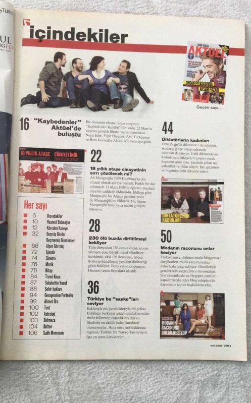 YENİ AKTÜEL – SAYI 239 – 17/30 MART 2011 – 106 SAYFA – SİGARA YASAĞINDA SIKIYÖNETİM: YENİ CEZALAR, ÖZEL DEVRİYELER, ANİ BASKINLAR – ATAŞE CİNAYETİ: 18 YILLIK SIR ÇÖZÜLECEK Mİ? – BUZ İÇİNDE 230 ÖLÜ DİRİLMEYİ BEKLİYOR – “KAYBEDENLER KULÜBÜ” FİLMİ: NEJAT İŞLER, YİĞİT ÖZŞENER, AHU TÜRKPENÇE, RIZA KOCAOĞLU – TÜRKİYE BU “SAYKO”LARI SEVİYOR: EN ARIZA DİZİ VE FİLM KARAKTERLERİ – DİKTATÖRLERİN KADINLARI: ŞATAFATLI YILLARDAN YOKSULLUĞA – MODANIN RACONUNU ONLAR KESİYOR: TÜRKİYE’NİN EN TAKİP EDİLEN MODA BLOGGERLARI – “GÖREVLİLERDE ‘DAHA FAZLA KİŞİ ÖLSÜN’ GİBİ BİR RUH HALİ VARDI” – ORGAN PİYASASINDA LAKŞAM PAZARI – PAPALIK OKULUNUN TÜRK ÖĞRENCİLERİ – PERA’DA KADIN SAĞLIĞI – ENGİN ALTAN DÜZYATAN – CHARLIE SHEEN İÇERİDE – MERT FIRAT – CARTEL – “SEN TÜRKİYE’NİN KİM OLDUĞUNU BİLİYOR MUSUN?” – “ÇOĞULCULAŞALIM DERKEN ÇORBALAŞTIK” - NEJAT İŞLER – YİĞİT ÖZŞENER – AHU TÜRKPENÇE – RIZA KOCAOĞLU – ALİ MANGAOĞLU – MÜFİT YÜKSEL – ANDRÉ KONZE – ŞADİYE ŞENGİ – CHARLIE SHEEN – MERT FIRAT – ENGİN ALTAN DÜZYATAN –, Ercan Arıklı tarafından kaleme alınmıştır. Eser Önay Bilgin editörlüğünde hazırlanmıştır. Kitap 1 Numara Hearst Yayıncılık tarafından yayınlanmıştır. 98 sayfadır. YENİ AKTÜEL – SAYI 239 – 17/30 MART 2011 – 106 SAYFA – SİGARA YASAĞINDA SIKIYÖNETİM: YENİ CEZALAR, ÖZEL DEVRİYELER, ANİ BASKINLAR – ATAŞE CİNAYETİ: 18 YILLIK SIR ÇÖZÜLECEK Mİ? – BUZ İÇİNDE 230 ÖLÜ DİRİLMEYİ BEKLİYOR – “KAYBEDENLER KULÜBÜ” FİLMİ: NEJAT İŞLER, YİĞİT ÖZŞENER, AHU TÜRKPENÇE, RIZA KOCAOĞLU – TÜRKİYE BU “SAYKO”LARI SEVİYOR: EN ARIZA DİZİ VE FİLM KARAKTERLERİ – DİKTATÖRLERİN KADINLARI: ŞATAFATLI YILLARDAN YOKSULLUĞA – MODANIN RACONUNU ONLAR KESİYOR: TÜRKİYE’NİN EN TAKİP EDİLEN MODA BLOGGERLARI – “GÖREVLİLERDE ‘DAHA FAZLA KİŞİ ÖLSÜN’ GİBİ BİR RUH HALİ VARDI” – ORGAN PİYASASINDA LAKŞAM PAZARI – PAPALIK OKULUNUN TÜRK ÖĞRENCİLERİ – PERA’DA KADIN SAĞLIĞI – ENGİN ALTAN DÜZYATAN – CHARLIE SHEEN İÇERİDE – MERT FIRAT – CARTEL – “SEN TÜRKİYE’NİN KİM OLDUĞUNU BİLİYOR MUSUN?” – “ÇOĞULCULAŞALIM DERKEN ÇORBALAŞTIK” - NEJAT İŞLER – YİĞİT ÖZŞENER – AHU TÜRKPENÇE – RIZA KOCAOĞLU – ALİ MANGAOĞLU – MÜFİT YÜKSEL – ANDRÉ KONZE – ŞADİYE ŞENGİ – CHARLIE SHEEN – MERT FIRAT – ENGİN ALTAN DÜZYATAN – adlı eser Türkçe dilindedir.