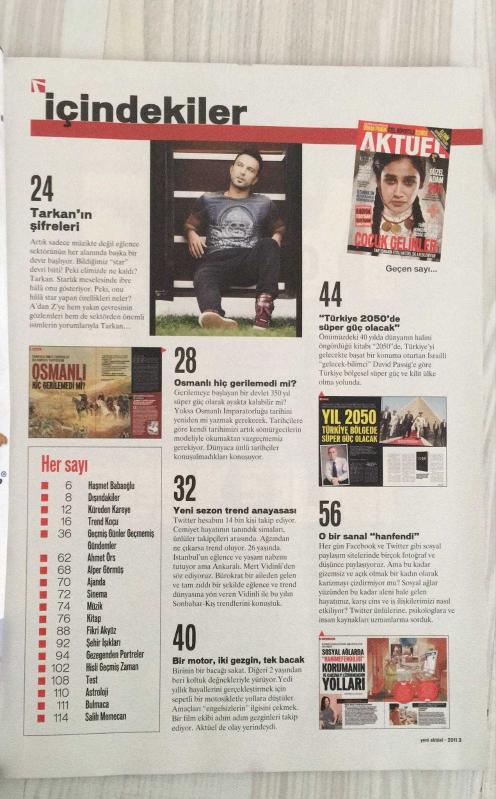 YENİ AKTÜEL – SAYI 253 – 29 EYLÜL / 12 EKİM 2011 – 114 SAYFA – EĞLENCEDEN MODAYA, YEME İÇMEDEN MÜZİĞE... BİLDİĞİNİZ HER TARZI UNUTUN – SONBAHAR-KIŞ TREND ANAYASASI – ORHAN GENCEBAY İLE KOZMİK HAKİKATLER – VAHŞİ DOĞADA FITNESS: SON ZAYIFLAMA YÖNTEMİ TÜRKİYE’DE – 'SON STAR'IN SIRRI NE? – TARKAN’IN ŞİFRELERİ – MİLLİ TAKIMIN KARNESİ: HANGİ FUTBOLCU HANGİ OKULDAN MEZUN? – ÖLÜM LİSTESİNDEKİ ÇEÇENLER AKTÜEL’E KONUŞTU – YOKSA OSMANLI HİÇ GERİLEMEDİ Mİ? – MODERN EVLİYA ÇELEBİ’LER ANLATIYOR: SIRT ÇANTALILAR, SARI CEKETLİLER, ÇOK GEZENLER KULÜBÜ, TANRI MİSAFİRLERİ – TÜRKİYE 2050’DE SÜPER GÜÇ OLACAK – SOSYAL MEDYADA HANIMEFENDİLİĞİ KORUMA TUYOLARI – FACEBOOK VE TWITTER’DA KARİZMA NASIL KORUNUR? – BİR MOTOR, İKİ GEZGIN, TEK BACAK: ENGELSİZLER İÇİN YOLA DÜŞTÜLER – ÇOCUK GELİNLER: TARTIŞMANIN FITİLİ AKTÜEL’DE ATEŞLENİYOR – MERT VİDİNLİ İLE TREND DÜNYASININ NABZI – EN YENİ FOTOĞRAFLAR EŞLİĞİNDE TARKAN’IN ŞİFRELERİ – İSTANBUL’UN BÜYÜK CEO’SU – İÇİNDEKİLER: HAŞMET BABAOĞLU – KÜREDEN KAREYE – TREND KOÇU, Ercan Arıklı tarafından kaleme alınmıştır. Eser Önay Bilgin editörlüğünde hazırlanmıştır. Kitap 1 Numara Hearst Yayıncılık tarafından yayınlanmıştır. 114 sayfadır. YENİ AKTÜEL – SAYI 253 – 29 EYLÜL / 12 EKİM 2011 – 114 SAYFA – EĞLENCEDEN MODAYA, YEME İÇMEDEN MÜZİĞE... BİLDİĞİNİZ HER TARZI UNUTUN – SONBAHAR-KIŞ TREND ANAYASASI – ORHAN GENCEBAY İLE KOZMİK HAKİKATLER – VAHŞİ DOĞADA FITNESS: SON ZAYIFLAMA YÖNTEMİ TÜRKİYE’DE – 'SON STAR'IN SIRRI NE? – TARKAN’IN ŞİFRELERİ – MİLLİ TAKIMIN KARNESİ: HANGİ FUTBOLCU HANGİ OKULDAN MEZUN? – ÖLÜM LİSTESİNDEKİ ÇEÇENLER AKTÜEL’E KONUŞTU – YOKSA OSMANLI HİÇ GERİLEMEDİ Mİ? – MODERN EVLİYA ÇELEBİ’LER ANLATIYOR: SIRT ÇANTALILAR, SARI CEKETLİLER, ÇOK GEZENLER KULÜBÜ, TANRI MİSAFİRLERİ – TÜRKİYE 2050’DE SÜPER GÜÇ OLACAK – SOSYAL MEDYADA HANIMEFENDİLİĞİ KORUMA TUYOLARI – FACEBOOK VE TWITTER’DA KARİZMA NASIL KORUNUR? – BİR MOTOR, İKİ GEZGIN, TEK BACAK: ENGELSİZLER İÇİN YOLA DÜŞTÜLER – ÇOCUK GELİNLER: TARTIŞMANIN FITİLİ AKTÜEL’DE ATEŞLENİYOR – MERT VİDİNLİ İLE TREND DÜNYASININ NABZI – EN YENİ FOTOĞRAFLAR EŞLİĞİNDE TARKAN’IN ŞİFRELERİ – İSTANBUL’UN BÜYÜK CEO’SU – İÇİNDEKİLER: HAŞMET BABAOĞLU – KÜREDEN KAREYE – TREND KOÇU adlı eser Türkçe dilindedir.