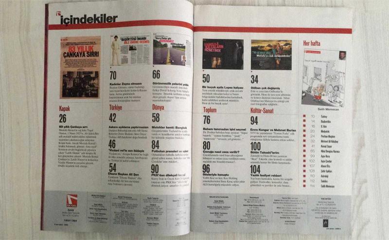 YENİ AKTÜEL – SAYI 49 – 15/21 HAZİRAN 2006 – 114 SAYFA – 83 YILLIK ÇANKAYA SIRRI: ATATÜRK, TOPAL OSMAN’IN SALDIRISINDAN ÇARŞAF GİYEREK Mİ KURTULDU? – LATİFE HANIM KİTABIYLA GÜN YÜZÜNE ÇIKAN DETAYLAR – VİCDANİ RETTE SON İKİDEYİZ – ALİ ŞEN: “BEN AZİZ YILDIRIM’I BİTİRMEDİM, O BENİ BİTİRDİ” – GÜLBEN ERGEN: “ARTIK RAKİPSİZİM” – 45 GÜNDE LOPEZ KALÇASI: ESTETİKTE YENİ TEKNİKLER – GÖRÜNMEZLİK MADDESİ BULUNDU: DAVID SCHURIG’LE RÖPORTAJ – BAŞÖRTÜSÜ İMANIN BİLE ÖNÜNE GEÇMİŞ Mİ? REYHAN GÜRTUNA’DAN TEPKİLER – ASKERE AÇIKLAMA YAPTIRMAZSIN: AKIN ÖZÇER’LE TÜRKİYE-AB İLİŞKİLERİ – MELEKLER KENTİ BANGKOK – FUTBOLUN PRENSLERİ VE EŞLERİ – PKK’DAN DİLEKÇELİ KAÇIŞ – BABANI TANIMADAN MESLEK SEÇMEK: DR. POULTER’IN SINIFLAMASI – ÇOCUĞA NASIL CEZA VERİLİR? – SUNA KIRAÇ: GÖZLERİYLE KONUŞTU – GÜLBEN ERGEN’İN DEĞİŞİMİ: MALEZYA FOTOĞRAFLARIYLA – EMRE KONGAR VS MEHMET BARLAS: “YORUM FARKI” KAMERA ARKASI – TAKESHI KITANO’DAN YENİ FİLM – YAZLIK FAALİYET REHBERİ: SERGİLER, FEST, Ercan Arıklı tarafından kaleme alınmıştır. Eser Önay Bilgin editörlüğünde hazırlanmıştır. Kitap 1 Numara Hearst Yayıncılık tarafından yayınlanmıştır. 114 sayfadır. YENİ AKTÜEL – SAYI 49 – 15/21 HAZİRAN 2006 – 114 SAYFA – 83 YILLIK ÇANKAYA SIRRI: ATATÜRK, TOPAL OSMAN’IN SALDIRISINDAN ÇARŞAF GİYEREK Mİ KURTULDU? – LATİFE HANIM KİTABIYLA GÜN YÜZÜNE ÇIKAN DETAYLAR – VİCDANİ RETTE SON İKİDEYİZ – ALİ ŞEN: “BEN AZİZ YILDIRIM’I BİTİRMEDİM, O BENİ BİTİRDİ” – GÜLBEN ERGEN: “ARTIK RAKİPSİZİM” – 45 GÜNDE LOPEZ KALÇASI: ESTETİKTE YENİ TEKNİKLER – GÖRÜNMEZLİK MADDESİ BULUNDU: DAVID SCHURIG’LE RÖPORTAJ – BAŞÖRTÜSÜ İMANIN BİLE ÖNÜNE GEÇMİŞ Mİ? REYHAN GÜRTUNA’DAN TEPKİLER – ASKERE AÇIKLAMA YAPTIRMAZSIN: AKIN ÖZÇER’LE TÜRKİYE-AB İLİŞKİLERİ – MELEKLER KENTİ BANGKOK – FUTBOLUN PRENSLERİ VE EŞLERİ – PKK’DAN DİLEKÇELİ KAÇIŞ – BABANI TANIMADAN MESLEK SEÇMEK: DR. POULTER’IN SINIFLAMASI – ÇOCUĞA NASIL CEZA VERİLİR? – SUNA KIRAÇ: GÖZLERİYLE KONUŞTU – GÜLBEN ERGEN’İN DEĞİŞİMİ: MALEZYA FOTOĞRAFLARIYLA – EMRE KONGAR VS MEHMET BARLAS: “YORUM FARKI” KAMERA ARKASI – TAKESHI KITANO’DAN YENİ FİLM – YAZLIK FAALİYET REHBERİ: SERGİLER, FEST adlı eser Türkçe dilindedir.