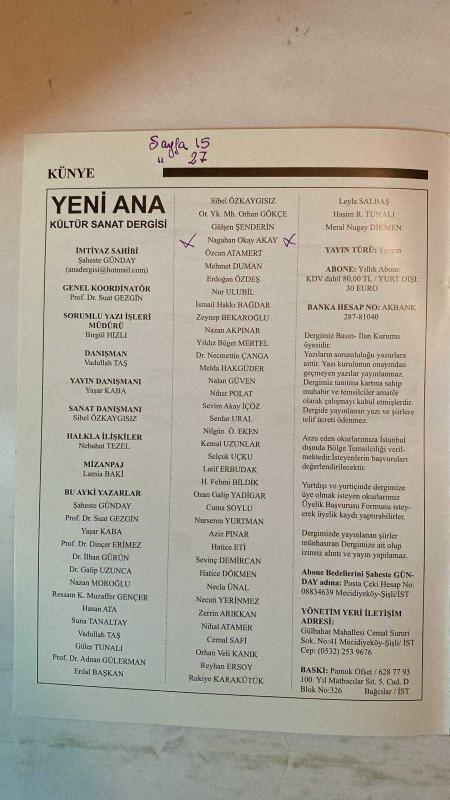 YENİ ANA KÜLTÜR SANAT, ŞİİR DERGİSİ - MART–NİSAN 2015 — SAYI: 23 DR. GALİP UZUNCA - NAZAN MOROĞLU - K. MUZAFFER GENÇER - HASAN ATA - SUNA TANALTAY - VADULLAH TAŞ - GÜLER TUNALI - PROF. DR. ADNAN GÜLERMAN - ERDAL BAŞKAN - ORHAN GÖKÇE - GÜLŞEN ŞENDERİN - NAGAHAN OKAY AKAY - ÖZCAN ATAMERT - MEHMET DUMAN - ERDOĞAN ÖZDEŞ - NUR ULUBİL - İSMAİL HAKKI BAĞDAR - ZEYNEP BEKAROĞLU - NAZAN AKPINAR - YILDIZ BÜGET MERTEL - DR. NECMETTİN ÇANGA - MELDA HAKGÜDER - NALAN GÜVEN - NİHAT POLAT - SEVİM AKAY İÇÖZ - SERDAR URAL - NILGÜN Ö. EKEN - KEMAL UZUNLAR - SELÇUK UÇKU - LATİF ERBUDAK - H. FEHMI BİLDİK - OZAN GALİP YADİGAR - CUMA SOYLU - NURSEREN YURTMAN - AZİZ PINAR - HATİCE ETİ - SEVİNÇ DEMİRCAN - HATİCE DÖKMEN - NECLÂ ÜNAL - NECATİ YERİNMEZ - ZERRİN ARIKKAN - NIHÂL ATAMER - CEMAL SAFİ - ORHAN VELİ KANIK - REYHAN ERSOY - RUKİYE KARAKÜTÜK - LEYLA SALBAŞ - HAŞİM R. TUNALI - MERAL NUGAY DİKMEN KÜLTÜR SANAT — KADIN VE YURTTAŞ HAKLARI — SEVGİ, SAYGI VE BAŞARI — RÜYALAR ALEMİNDE — KİBELE - TAM TAKIM 36 SAYFA adlı eser, Kitap > Süreli Yayınlar > Dergiler > Magazin, Moda kategorisinde İkinci El olarak satıştadır.