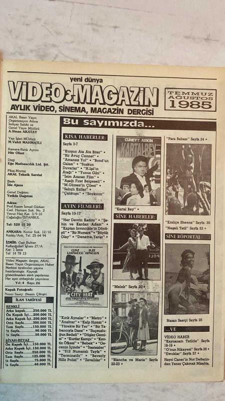 YENİ DÜNYA, VİDEO & MAGAZİN AYLIK VİDEO, SİNEMA, MAGAZİN DERGİSİ - TEMMUZ-AĞUSTOS 1985 - NAZAN SAATÇİ - CÜNEYT ARKIN - KARTAL BEY - HÜLYA AVŞAR - İBRAHİM TATLISES - MEHMET AYDIN - HÜLYA IŞIL - YADİGAR EJDER - SEVGİ SAYUNER - HİDAYET PELİT - KAZIM KARABEKİR - ÜMİT EFEKAN - MERAL ORHONŞAY - FARUK TANAZ - ERHAN CANAN - AYŞE TUNALI - BÜLENT BİLGİÇ - YILDIRIM GENÇER - BURT REYNOLDS - CLINT EASTWOOD MELEK - NEŞELİ TATİL - PARA BABASI - KRALİÇE SHEENA - BLANCHE VE MARIE - BELA KAYNANA - MAVİ MAVİ - SUSKUN DUVARLAR - YUNUS GİBİ - ASSOLİST - HER DEVRİN KADINI - TERMİNATÖR - BEVERLY HILLS POLİSİ - CITY HEAT - KARTAL BEY - TAM TAKIM EKSİKSİZ 34 SAYFA, A. SİNAN AKATAY tarafından kaleme alınmıştır. Eser M. VAHİT MAHMATLI editörlüğünde hazırlanmıştır. Kitap [EGE MATBAACILIK] yayınlanmıştır. 34 sayfadır. YENİ DÜNYA, VİDEO & MAGAZİN AYLIK VİDEO, SİNEMA, MAGAZİN DERGİSİ - TEMMUZ-AĞUSTOS 1985 - NAZAN SAATÇİ - CÜNEYT ARKIN - KARTAL BEY - HÜLYA AVŞAR - İBRAHİM TATLISES - MEHMET AYDIN - HÜLYA IŞIL - YADİGAR EJDER - SEVGİ SAYUNER - HİDAYET PELİT - KAZIM KARABEKİR - ÜMİT EFEKAN - MERAL ORHONŞAY - FARUK TANAZ - ERHAN CANAN - AYŞE TUNALI - BÜLENT BİLGİÇ - YILDIRIM GENÇER - BURT REYNOLDS - CLINT EASTWOOD MELEK - NEŞELİ TATİL - PARA BABASI - KRALİÇE SHEENA - BLANCHE VE MARIE - BELA KAYNANA - MAVİ MAVİ - SUSKUN DUVARLAR - YUNUS GİBİ - ASSOLİST - HER DEVRİN KADINI - TERMİNATÖR - BEVERLY HILLS POLİSİ - CITY HEAT - KARTAL BEY - TAM TAKIM EKSİKSİZ 34 SAYFA adlı eser Türkçe dilindedir.