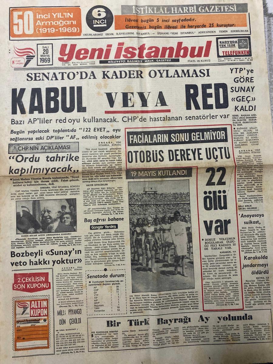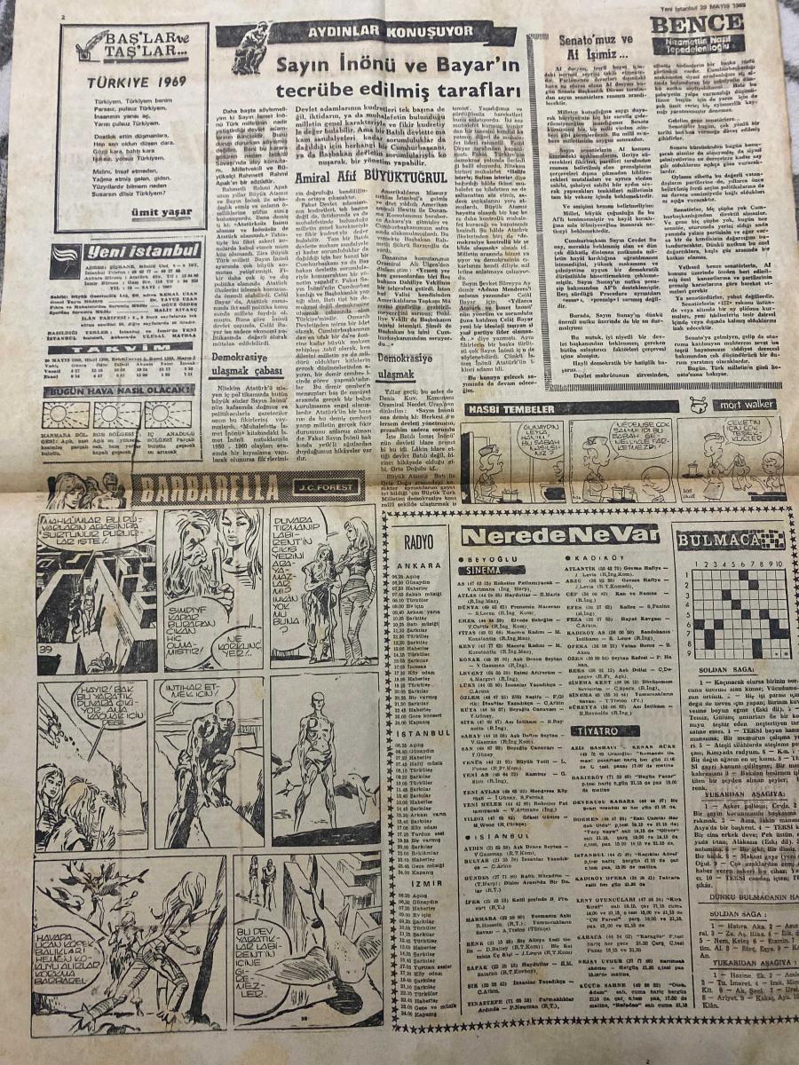 YENİ İSTANBUL GAZETESİ - DOĞUM GÜNÜ HEDİYESİ (TURKISH NEWSPAPPER) - 20 MAYIS 1969 - SADECE İKİ SAYFADIR -Kemal Uzan-İsmet İnönü-Celal Bayar-Amiral Afif Büyüktuğrul-Ümit Yaşar-Senato’da kader oylaması-Kabul veya red-Bazı AP’liler red oyu kullanacak CHP’de hastalanan senatörler var-CHP’nin açıklaması Ordu tahrike kapılmayacak-Bozbeyli Sunay’ın veto hakkı yoktur-Faciaların sonu gelmiyor Otobüs dereye uçtu-22 ölü var-19 Mayıs kutlandı-Bir Türk Bayrağı Ay yolunda-Başlar ve taşlar Türkiye 1969-Sayın İnönü ve Bayar’ın tecrübe edilmiş tarafları-Demokrasiye ulaşma çabası-Senatomuz ve Af işimiz-Bence-Aydınlar konuşuyor-Barbarella-Nerede Ne Var-Bulmaca-Radyo Ankara İstanbul İzmir-Tiyatro adlı eser Türkçe dilindedir.