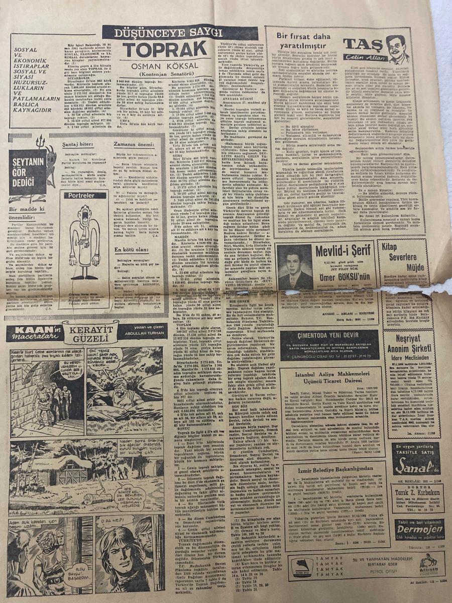 YENİ İSTANBUL GAZETESİ - DOĞUM GÜNÜ HEDİYESİ (TURKISH NEWSPAPPER) - 7 ARALIK 1968 - SADECE İKİ SAYFADIR -Nur Ökten-İlhanı Soysal-U Thant-Hamdi Yılmaz-Cemalettin Yavaşlar-Osman Köksal-Çetin Altan-Ömer Göksu-Abdullah Turhan-Mehmet Erol-Grevde gözcüye 8 kurşun sıkıldı-Asker ve sivil aydın zümre ikinci plâna itilmiştir-Gizli yapılması icap eden başkanlık seçimi açık oyla yapıldığından-Demirel’in AP başkanlığı iptal ediliyor-Kanser ilâcını buldu ama ruhsat alamıyor-Hükümetin ciddiyeti-Kabinede 5 bakan nezle oldu-Lise mezunlarının yedek öğretmenlik için direnmeleri istendi-Kar yağışı bekleniyor-Düşünceye saygı Toprak-Sosyal ve ekonomik istiraplar sosyal ve siyasi huzursuzlukların patlamaların başlıca kaynağıdır-Şeytanın gör dediği-Bir madde ki önemlidir-Portreler-Santaj biter-Zamanın önemi-En kötü olan-Toprak-Bir fırsat daha yaratılmıştır-Taş-Mevlid-i Şerif-Kitap severlere müjde-Kerayit güzeli-İstanbul Asliye Mahkemeleri üçüncü ticaret dairesi-İzmir Belediye Başkanlığından-Nesriyat Anonim Şi adlı eser, Kitap > Süreli Yayınlar > Gazeteler > Türkiye > Genel > Günlük kategorisinde İkinci El olarak satıştadır.