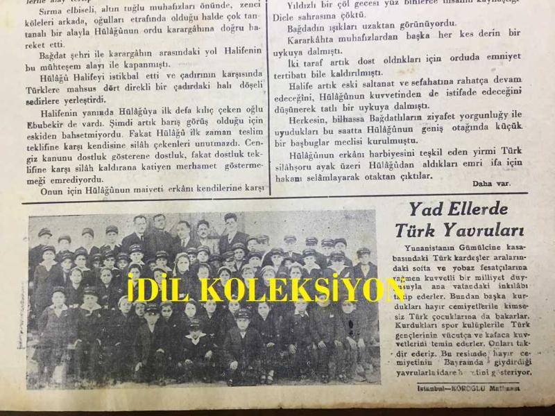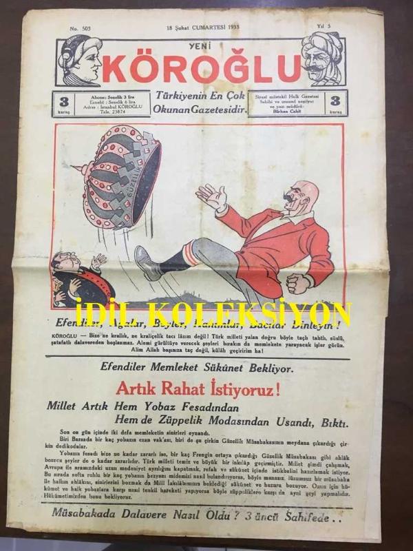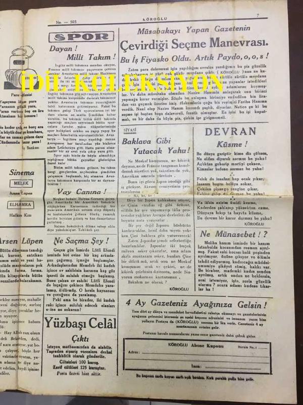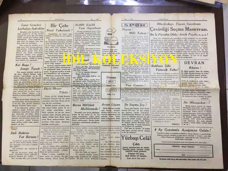 YENİ KÖROĞLU GAZETESİ - 18 ŞUBAT 1933 - SAYI: 503 - EFENDİLER, MEMLEKET SÜKUNET BEKLİYOR. MİLLET ARTIK HEM YOBAZ FESADINDAN HEM DE ZÜPPELİK MODASINDAN USANDI, BIKTI - MÜSABAKADA DALAVERE NASIL OLDU? - İZMİR GENÇLERİ LEVHALARI İNDİRDİLER - KEL BAŞA ŞİMŞİK TARAK - DELİ BEKİRİN YAT BORUSU - BİR ÇETE NASIL YAKALANDI? - BÖYLE MEZAR YIKILIR - 10,000 KİŞİLİK YENİ HAPİSHANE - ŞAH İSMAİL ARNAVUT ÇAKISI! - BURSA MÜFTÜSÜ MAHKEMEDE! - PARA MANİSİ - SİNEMA MELEK, ARSEN LÜPEN, SİNEMA ELHAMRA, HALKIN KIZI - YÜZBAŞI CELAL - DAYAN MİLLİ TAKIM - HALİFE İLE HÜLAGU, İSLAM TARİHİ, HÜLAĞU ORDUSUNDA BİR GECE! HALİFE VE OĞULLARI DERİN VE TATLI BİR UYKUYA DALMIŞLARDI. BU SIRADA HÜLAĞUNUN ÇADIRINDA... - YAD ELLERDE TÜRK YAVRULARI - YUNANİSTAN GÜLÜMCİNE KASABASI GENÇLERİNİN TOPLU FOTOĞRAFI, 1933 adlı eser, Kitap > Süreli Yayınlar > Gazeteler > Türkiye kategorisinde İkinci El olarak satıştadır.
