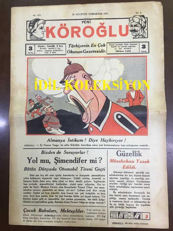YENİ KÖROĞLU GAZETESİ - 20 AĞUSTOS 1932 - SAYI: 451 - ALMANYA İNTİKAM DİYE BAĞIRIYOR! - YOL MU, ŞİMENDİFER Mİ? - GÜZELLİK MÜSABAKASI İPTAL EDİLDİ - ÇOCUK BABALARI, MEKTEPLİLER - İSTANBUL BU! - AYI NEZAKETİ - ERZURUM'DA SEYLAP - KADI EFENDİ AKLIN NEREDE? - 1 YILDA 2500 HIRSIZLIK - PAPAS MEKTEPLERİ - BACADAN KAÇANLAR - HEP KADIN İŞİ - SAMSUNLULAR - HAPİSHANEDE - HACCACI ZALİM - HACCAÇ ARAPLARIN KAFASINI KESTİRDİ, DİRİ DİRİ DERİSİNİ YÜZDÜRDÜ - HACCACIN NUTKU - İPEKİŞ YERLİ MALLARI SERGİSİ BURSA - ESNAF ve EHALİ BANKASI MEMURLARI FOTOĞRAFI - HALİÇ İLERİSPOR TAKIMI FOTOĞRAFI, BÜRHAN CAHİT tarafından kaleme alınmıştır. Kitap KÖROĞLU MATBAASI tarafından [İSTANBUL] yayınlanmıştır. 4 sayfadır. YENİ KÖROĞLU GAZETESİ - 20 AĞUSTOS 1932 - SAYI: 451 - ALMANYA İNTİKAM DİYE BAĞIRIYOR! - YOL MU, ŞİMENDİFER Mİ? - GÜZELLİK MÜSABAKASI İPTAL EDİLDİ - ÇOCUK BABALARI, MEKTEPLİLER - İSTANBUL BU! - AYI NEZAKETİ - ERZURUM'DA SEYLAP - KADI EFENDİ AKLIN NEREDE? - 1 YILDA 2500 HIRSIZLIK - PAPAS MEKTEPLERİ - BACADAN KAÇANLAR - HEP KADIN İŞİ - SAMSUNLULAR - HAPİSHANEDE - HACCACI ZALİM - HACCAÇ ARAPLARIN KAFASINI KESTİRDİ, DİRİ DİRİ DERİSİNİ YÜZDÜRDÜ - HACCACIN NUTKU - İPEKİŞ YERLİ MALLARI SERGİSİ BURSA - ESNAF ve EHALİ BANKASI MEMURLARI FOTOĞRAFI - HALİÇ İLERİSPOR TAKIMI FOTOĞRAFI adlı eser Türkçe dilindedir.