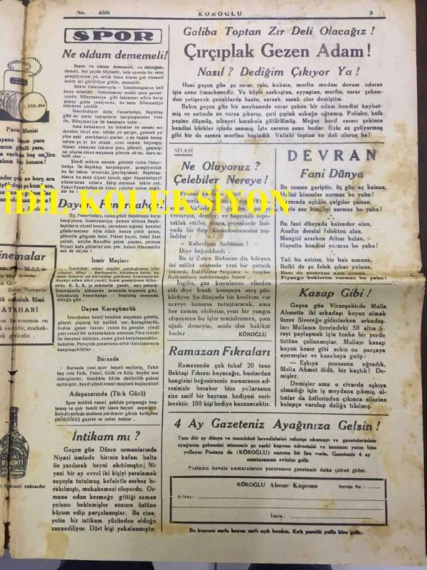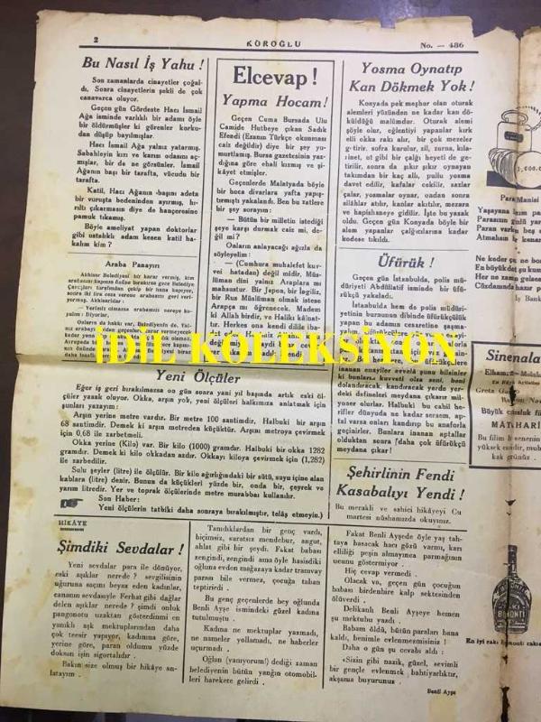 YENİ KÖROĞLU GAZETESİ - 21 ARALIK (KANUNUEVVEL) 1932 - SAYI: 486 - SIRP-İTALYAN POLİTİKASI DAVUL DERİSİ GİBİ GERİLDİ - GÜMÜŞ CUMHURİYET LİRALARI BASILIYOR - HÜLAĞU ARAP HALİFEYİ HAMAMDAN NASIL ÇIKARDI? HİKAYE, ŞİMDİKİ SEVDALAR - YOSMA OYNAYIP KAN DÖKMEK YOK! - ÜFÜRÜK! - ŞEHİRLİNİN FENDİ KASABAYI YENDİ! - SİNEMALAR, ELHAMRA, MELEK, GRETA GARBO, RAMON NAVARRO, BÜYÜK CASUSLUK FİLMİ MATAHARİ - BOMONTİ RAKI - DAYAN FENERBAHÇE! - ÇIRILPILKA GEZEN ADAM! - RAMAZAN FIKRALARI - KANLI KULE CİNAYETİ, DAYAK! - TÜRK NELER YAPAR? - ANADOLU ORTASINDA TÜRK VARLIĞI - ÇANKIRI ORTA MEKTEBİ İKİNCİ SINIF GENÇLERİ FOTOĞRAFI, BÜRHAN CAHİT MORKAYA tarafından kaleme alınmıştır. Kitap KÖROĞLU MATBAASI tarafından [İSTANBUL] yayınlanmıştır. 4 sayfadır. YENİ KÖROĞLU GAZETESİ - 21 ARALIK (KANUNUEVVEL) 1932 - SAYI: 486 - SIRP-İTALYAN POLİTİKASI DAVUL DERİSİ GİBİ GERİLDİ - GÜMÜŞ CUMHURİYET LİRALARI BASILIYOR - HÜLAĞU ARAP HALİFEYİ HAMAMDAN NASIL ÇIKARDI? HİKAYE, ŞİMDİKİ SEVDALAR - YOSMA OYNAYIP KAN DÖKMEK YOK! - ÜFÜRÜK! - ŞEHİRLİNİN FENDİ KASABAYI YENDİ! - SİNEMALAR, ELHAMRA, MELEK, GRETA GARBO, RAMON NAVARRO, BÜYÜK CASUSLUK FİLMİ MATAHARİ - BOMONTİ RAKI - DAYAN FENERBAHÇE! - ÇIRILPILKA GEZEN ADAM! - RAMAZAN FIKRALARI - KANLI KULE CİNAYETİ, DAYAK! - TÜRK NELER YAPAR? - ANADOLU ORTASINDA TÜRK VARLIĞI - ÇANKIRI ORTA MEKTEBİ İKİNCİ SINIF GENÇLERİ FOTOĞRAFI adlı eser Türkçe dilindedir.