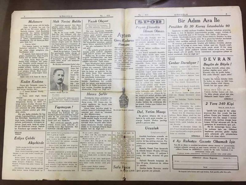 YENİ KÖROĞLU GAZETESİ - 3 EYLÜL 1932 - SAYI: 455 - EKMEK KAVGASI KIZIŞTI, DÜNYA NEREYE GİDİYOR DERSİNİZ? - 10 YIL MÜTAKERE - ROMANYA, RUSYA, İTALYA, FRANSA ORDULARI MANEVRADA - MAHMURE - KADIN KADINA - EVLİYA ÇELEBİ AKŞEHİR'DE - MUSTAFA HAYRİ BEY FOTOĞRAFI - HIRSIZ ŞOFÖR - AYTEN, GENÇ KIZLARIN ROMANI - BOMONTİ RAKI - PEYNİR EKMEKLE İDMAN OLMAZ - DUL, YETİM MAAŞI - PENDİK'TE ET 30 KURUŞ İSTANBUL'DA 90 KURUŞ - 2 YERE 340 KİŞİ - HACCACI ZALİM, ARAP TARİHİNDEN BİR PARÇA, ARAPLAR DİN GAYRETİYLE DEĞİL, ÇAPUL KEYFİLE SALDIRIYORLARDI. FAKAT TÜRKE DİŞ GEÇİREMEDİLER - PARA MI GÖNÜL MÜ? - KEMALETTİN ŞÜKRÜ - ÇOCUKLARA İSTİKBAL - MERSİN HAPİSHANESİ 1932 FOTOĞRAFI, HÜDAİ BEY, MUALLİM FERİDUN BEY - BERGAMA HANIMLARI 19632 FOTOĞRAFI, BÜRHAN CAHİT tarafından kaleme alınmıştır. Kitap KÖROĞLU MATBAASI tarafından [İSTANBUL] yayınlanmıştır. 4 sayfadır. YENİ KÖROĞLU GAZETESİ - 3 EYLÜL 1932 - SAYI: 455 - EKMEK KAVGASI KIZIŞTI, DÜNYA NEREYE GİDİYOR DERSİNİZ? - 10 YIL MÜTAKERE - ROMANYA, RUSYA, İTALYA, FRANSA ORDULARI MANEVRADA - MAHMURE - KADIN KADINA - EVLİYA ÇELEBİ AKŞEHİR'DE - MUSTAFA HAYRİ BEY FOTOĞRAFI - HIRSIZ ŞOFÖR - AYTEN, GENÇ KIZLARIN ROMANI - BOMONTİ RAKI - PEYNİR EKMEKLE İDMAN OLMAZ - DUL, YETİM MAAŞI - PENDİK'TE ET 30 KURUŞ İSTANBUL'DA 90 KURUŞ - 2 YERE 340 KİŞİ - HACCACI ZALİM, ARAP TARİHİNDEN BİR PARÇA, ARAPLAR DİN GAYRETİYLE DEĞİL, ÇAPUL KEYFİLE SALDIRIYORLARDI. FAKAT TÜRKE DİŞ GEÇİREMEDİLER - PARA MI GÖNÜL MÜ? - KEMALETTİN ŞÜKRÜ - ÇOCUKLARA İSTİKBAL - MERSİN HAPİSHANESİ 1932 FOTOĞRAFI, HÜDAİ BEY, MUALLİM FERİDUN BEY - BERGAMA HANIMLARI 19632 FOTOĞRAFI adlı eser Türkçe dilindedir.
