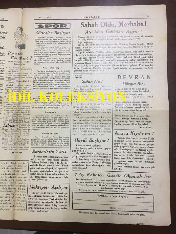 YENİ KÖROĞLU GAZETESİ - 7 EYLÜL 1932 - SAYI: 456 - AVRUPA'YI BİR EL KARIŞTIRIYOR AMA KİMİN ELİ? - HARP İSTİYORLAR - ALEM OK GİBİ GİDERKEN... - 10 KURUŞ YEVMİYE - AÇIK HESAP - AKREM-YILAN - SOFU HACA ve EVLİYA ÇELEBİ - 2000 LİRAYA BEKARLARA YAZIK OLUYOR - KURTULUŞ YOKTUR - BİR DÜĞÜN 3000 DAVETLİ 600 ATLI 500 KOYUN KESİLDİ 100 KAZAN PİLAV ZERDE YAPILDI - PARA MI GÖNÜL MÜ? - BERBERLERİN YARIŞI - MEKTEPLER AÇILIYOR - ATI ALAN ÜSKÜDAR'I AŞIYOR - ANAYA KIYILIR MI? - HACCACI ZALİM, ARAP TARİHİNDEN BİR PARÇA, BÜTÜN BASRA ve KÜFE KANA BOYANDI. KILIÇ KILICA - KEMALETTİN ŞÜKRÜ - KIBRIS ADASINDA TÜRK KIZLRI, KIBRIS KIZ LİSESİ 1932 MEZUNLARI FOTOĞRAFI, NİDAİ BEY - ÇOCUKLARA İSTİKBAL - BOKS, NURİ BEY FOTOĞRAFI, BÜRHAN CAHİT tarafından kaleme alınmıştır. Kitap KÖROĞLU MATBAASI tarafından [İSTANBUL] yayınlanmıştır. 4 sayfadır. YENİ KÖROĞLU GAZETESİ - 7 EYLÜL 1932 - SAYI: 456 - AVRUPA'YI BİR EL KARIŞTIRIYOR AMA KİMİN ELİ? - HARP İSTİYORLAR - ALEM OK GİBİ GİDERKEN... - 10 KURUŞ YEVMİYE - AÇIK HESAP - AKREM-YILAN - SOFU HACA ve EVLİYA ÇELEBİ - 2000 LİRAYA BEKARLARA YAZIK OLUYOR - KURTULUŞ YOKTUR - BİR DÜĞÜN 3000 DAVETLİ 600 ATLI 500 KOYUN KESİLDİ 100 KAZAN PİLAV ZERDE YAPILDI - PARA MI GÖNÜL MÜ? - BERBERLERİN YARIŞI - MEKTEPLER AÇILIYOR - ATI ALAN ÜSKÜDAR'I AŞIYOR - ANAYA KIYILIR MI? - HACCACI ZALİM, ARAP TARİHİNDEN BİR PARÇA, BÜTÜN BASRA ve KÜFE KANA BOYANDI. KILIÇ KILICA - KEMALETTİN ŞÜKRÜ - KIBRIS ADASINDA TÜRK KIZLRI, KIBRIS KIZ LİSESİ 1932 MEZUNLARI FOTOĞRAFI, NİDAİ BEY - ÇOCUKLARA İSTİKBAL - BOKS, NURİ BEY FOTOĞRAFI adlı eser Türkçe dilindedir.