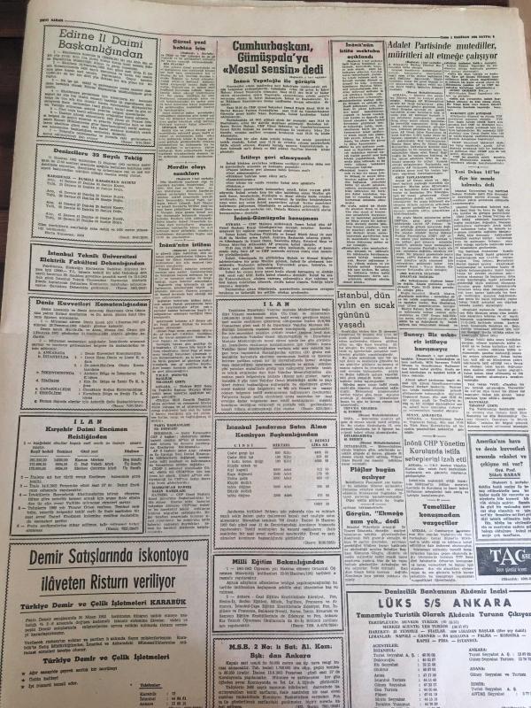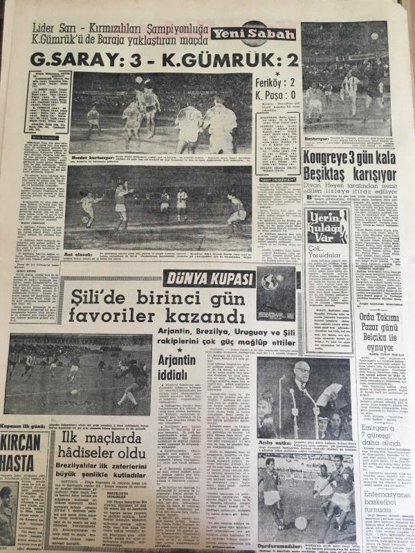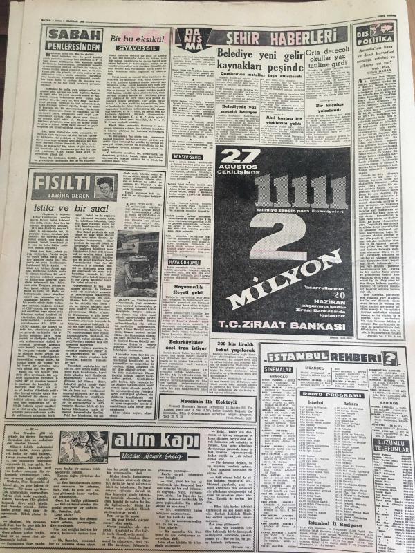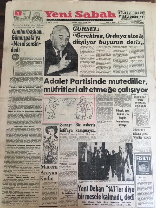 YENİ SABAH GAZETESİ 1 HAZİRAN 1962 YIL :25 SAYI :8338---Cumhurbaşkanı Gümüşpala 'ya Mesul sensin dedi ---Gürsel :Gerekirse Orduya Size İş Düşüyor Buyurun Deriz --Adalet Partisinde Mutediller Müfritleri Alt Etmeğe Çalışıyor --Sunay : Biz askeriz istifaya karışmayız --Yeni Dekan 147 ler diye bir mesele kalmadı dedi ---Bir bu eksikti :Siyavuşgil --Belediye yeni gelir kaynakları peşinde --Galatasaray :3 - K. Gümrük :2 --Feriköy :2 K. Paşa :0--Şili de birinci gün favoriler kazandı --Kongreye 3 gün kala Beşiktaş karışıyor -- Yıpranma, sararmalar, kupon kesiği ve yırtılmalar zamana bağlı olarak görülebilir.