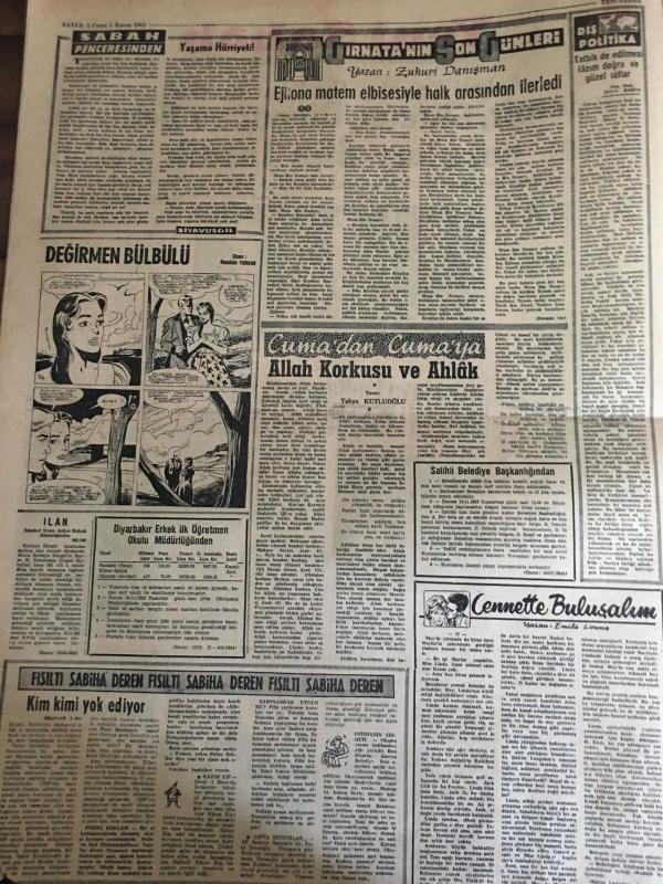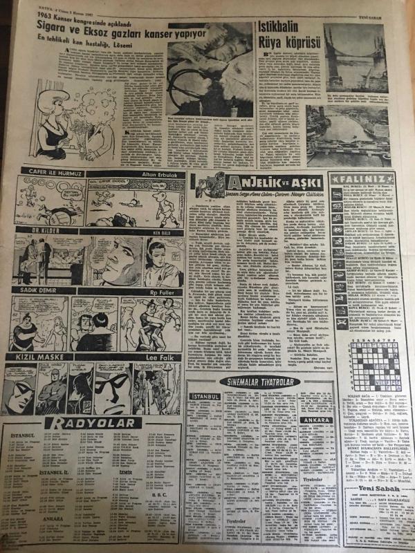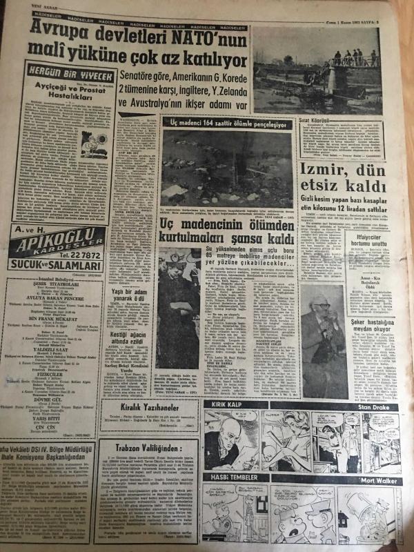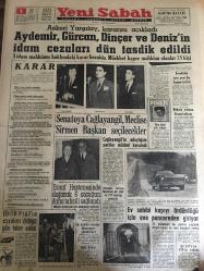 YENİ SABAH GAZETESİ 1 KASIM 1963 YIL : 26 SAYI :8849---Aydemir ,Gürcan ,Dinçer ve Deniz 'in idam cezaları dün tasdik edildi ---Senatoya Çağlayangil ,Meclise Sirmen Başkan Seçilecek ---Esnaf hastanesinde doğacak 6 çocuğun daha tahsili sağlandı ---Ev sahibi kapıyı ördürdüğü için eve pencereden giriyor ---Yaşama Hürriyeti :Siyavuşgil ---Avrupa Devletleri NATO 'nun Mali Yüküne Çok Az Katılıyor ----Üç Madencinin ölümünden kurtulmaları şansa kaldı ---Sigara ve Egzoz Gazları Kanser Yapıyor ---Galatasaray Federasyondan Tarafsız Kalmasını İstedi ---Beşiktaş bugün kampa giriyor --Kılıç ,Ece Turgay ve Talat Ceza Heyetine Verildiler --Lefter bugün Atina da ilk idmanında yaptıracak ---- Yıpranma, sararmalar, kupon kesiği ve yırtılmalar zamana bağlı olarak görülebilir.