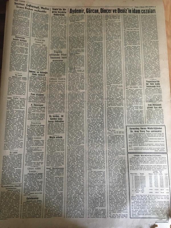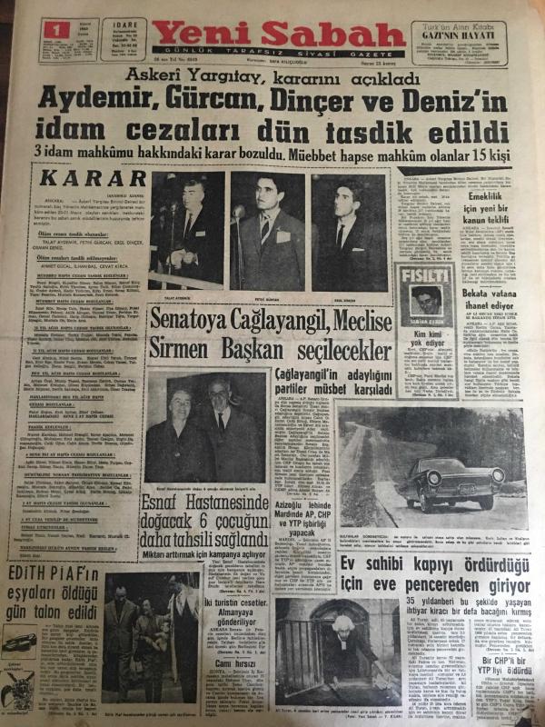 YENİ SABAH GAZETESİ 1 KASIM 1963 YIL : 26 SAYI :8849---Aydemir ,Gürcan ,Dinçer ve Deniz 'in idam cezaları dün tasdik edildi ---Senatoya Çağlayangil ,Meclise Sirmen Başkan Seçilecek ---Esnaf hastanesinde doğacak 6 çocuğun daha tahsili sağlandı ---Ev sahibi kapıyı ördürdüğü için eve pencereden giriyor ---Yaşama Hürriyeti :Siyavuşgil ---Avrupa Devletleri NATO 'nun Mali Yüküne Çok Az Katılıyor ----Üç Madencinin ölümünden kurtulmaları şansa kaldı ---Sigara ve Egzoz Gazları Kanser Yapıyor ---Galatasaray Federasyondan Tarafsız Kalmasını İstedi ---Beşiktaş bugün kampa giriyor --Kılıç ,Ece Turgay ve Talat Ceza Heyetine Verildiler --Lefter bugün Atina da ilk idmanında yaptıracak ----, SAFA KILIÇLIOĞLU tarafından kaleme alınmıştır. Kitap 1963 yılında [YENİ SABAH MATBAA] o ISBN kodu ile yayınlanmıştır. 6 sayfadır. YENİ SABAH GAZETESİ 1 KASIM 1963 YIL : 26 SAYI :8849---Aydemir ,Gürcan ,Dinçer ve Deniz 'in idam cezaları dün tasdik edildi ---Senatoya Çağlayangil ,Meclise Sirmen Başkan Seçilecek ---Esnaf hastanesinde doğacak 6 çocuğun daha tahsili sağlandı ---Ev sahibi kapıyı ördürdüğü için eve pencereden giriyor ---Yaşama Hürriyeti :Siyavuşgil ---Avrupa Devletleri NATO 'nun Mali Yüküne Çok Az Katılıyor ----Üç Madencinin ölümünden kurtulmaları şansa kaldı ---Sigara ve Egzoz Gazları Kanser Yapıyor ---Galatasaray Federasyondan Tarafsız Kalmasını İstedi ---Beşiktaş bugün kampa giriyor --Kılıç ,Ece Turgay ve Talat Ceza Heyetine Verildiler --Lefter bugün Atina da ilk idmanında yaptıracak ---- adlı eser Türkçe dilindedir.
