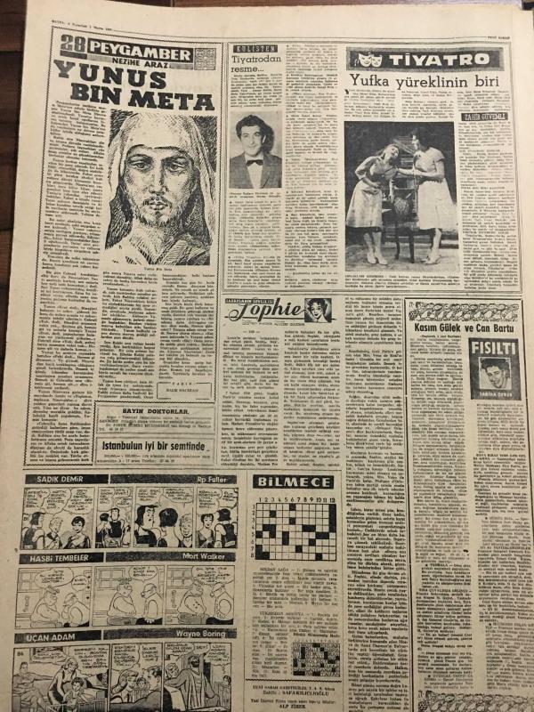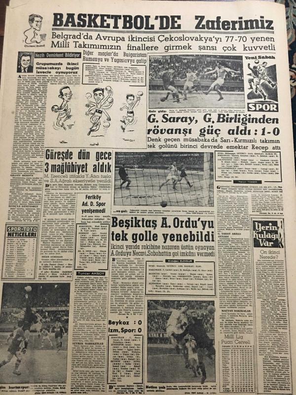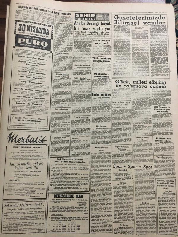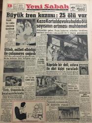 YENİ SABAH GAZETESİ 1 MAYIS 1961 YIL :23 SAYI:7950---Büyük tren kazası :25 ölü var ---Büyük bir radyo istasyonu kurulacak ---Gülek ,milleti elbirliği ile çalışmaya çağırdı --2 Trafik kazasında 3 kişi öldü ---Fatih Şilepinde de kaçak eşya bulundu ---Köprüde bir deli ,ustura ile dört kişiyi yaraladı --Tunceli çarşısında 24 dükkan yandı ---Patlayan bir bomba köylü çocuğu öldürdü ---AP 35 ilde teşkilat kurdu ---Ne yapsın bu köylüler ?: Siyavuşgil --Ertuğrul Muhsin in film rejisörlüğüne başlaması ve çevirdiği ilk filmler ---Radyo Programları ---Portekiz yazar ve aydınlarının manifestosu --Tavuk Vebası ile savaş başlıyor --3 Şaki vurularak öldürüldü ---Tiyatro :Yufka yüreklinin biri ---Anıtlar Derneği büyük bir tesis yaptırıyor --Tütün balıkları öldürüyormuş --Gazetelerimizde Bilimsel Yazılar --Basketbol da Zaferimiz --Güreş de dün gece 3 mağlubiyet aldık ---Galatasaray ,G.Birliğinden rövanşı güç aldı :1-0--Beşiktaş A.Ordu yu tek golle yenebildi --- Yıpranma, sararmalar, kupon kesiği ve yırtılmalar zamana bağlı olarak görülebilir.