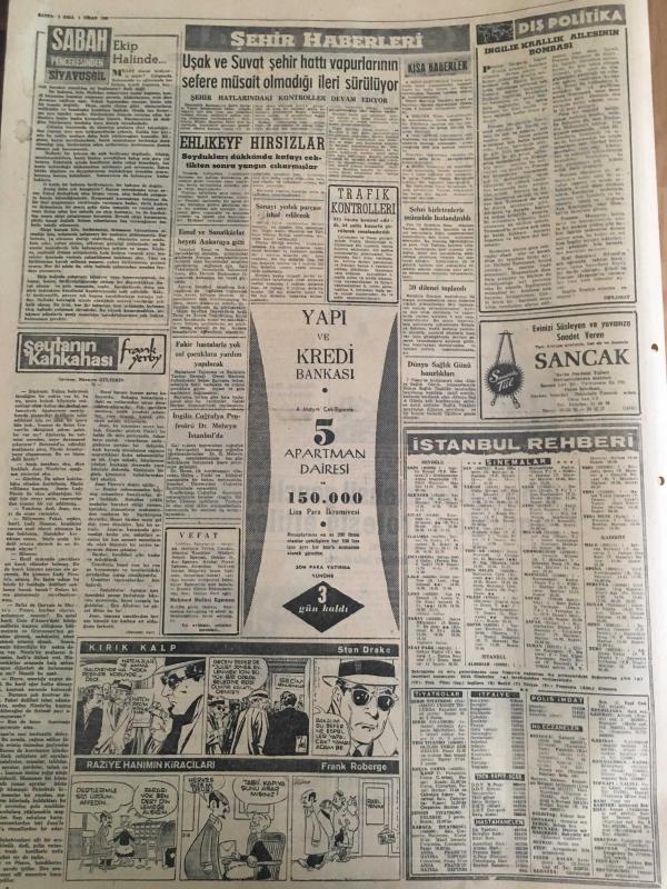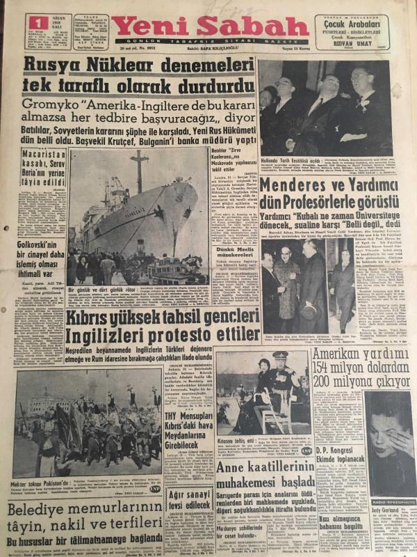 YENİ SABAH GAZETESİ 1 NİSAN 1958 YIL :20 SAYI :6853---Rusya Nüklear Denemeleri Tek Taraflı Olarak Durdurdu ---Menderes ve Yardımcı Dün Profesörlerle Görüştü ----Kıbrıs yüksek tahsil gençleri İngilizleri protesto ettiler --Amerikan yardımı 154 milyon dolardan 200 milyona çıkıyor ---Belediye memurlarının tayin nakil ve terfileri ---Ekip Halinde :Siyavuşgil ---1958 İmar Planı Tatbike Konuldu --Yeni Köy Kanunu Layihası Hazırlandı ---Fenerbahçe galip Moda şampiyon ---Beşiktaş İdare Heyeti Dün Vazife Taksimi Yaptı ---G.Milli Takımı Dün Sabah Uğurladık ---Federasyon Kupası Maçları Yarın Şehrimizde Başlıyor ---- Yıpranma, sararmalar, kupon kesiği ve yırtılmalar zamana bağlı olarak görülebilir.