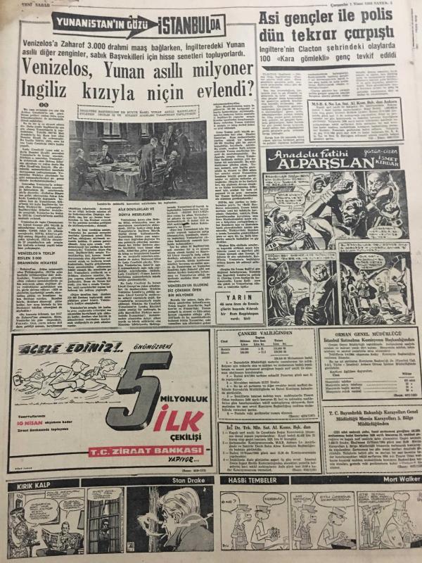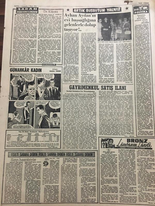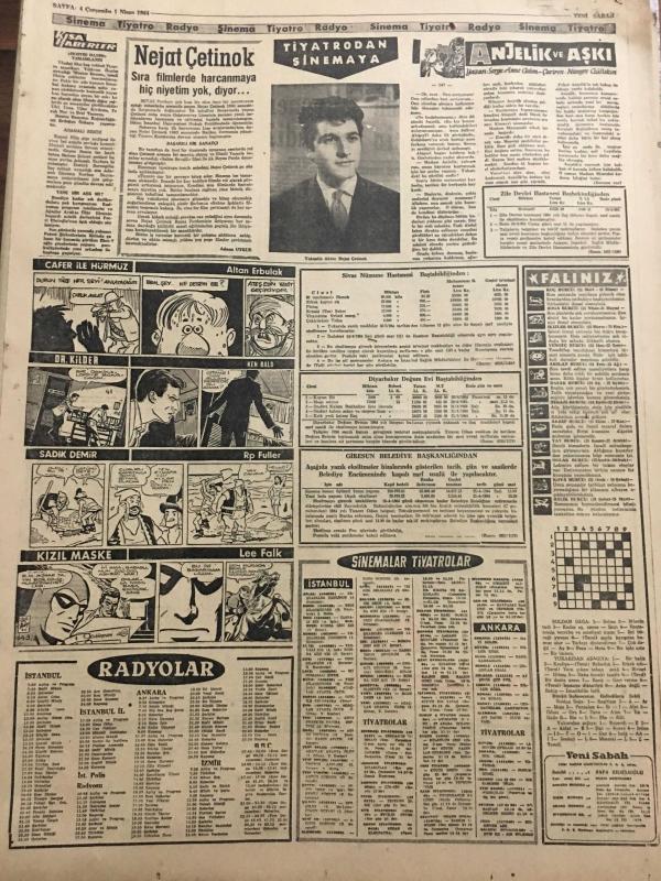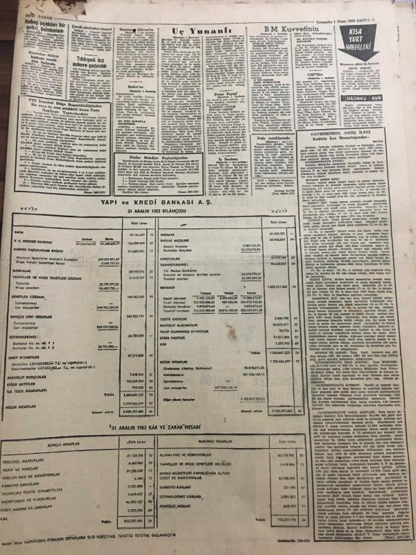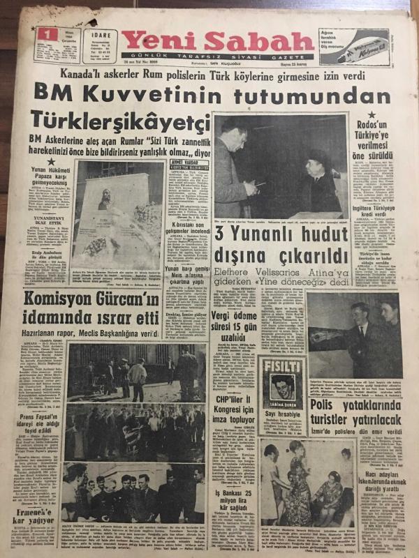 YENİ SABAH GAZETESİ 1 NİSAN 1964 YIL :26 SAYI :8999--BM Kuvvetinin Tutumundan Türkler Şikayetçi --Komisyon Gürcan 'ın idamında ısrar etti --3 Yunanlı hudut dışına çıkarıldı --Vergi ödeme süresi 15 günlüğüne uzatıldı --CHP 'liler ödeme süresi 15 gün uzatıldı --Polis yataklarında turistler yatırılacak --Rodos 'un Türkiye ye verilmesi öne sürüldü ---Dr.Kikota :Siyavuşgil --Ayhan Aydan 'ın evi başsağlığına gelenlerle dolup taşıyor ---Venizelos ,Yunan asıllı milyoner İngiliz kızıyla niçin evlendi ?--Nejat Çetinok :Sıra filmlerde harcanmaya hiç niyetim yok --Genç Millilerimiz Bugün İspanya ile Oynuyor --Turgay Yanlış Hareket Ettiğimi Anladım Dedi ---Fenerbahçelilerin dikkati çekildi --Türkiye Amatör Futbol Şampiyonası Maçları --- Yıpranma, sararmalar, kupon kesiği ve yırtılmalar zamana bağlı olarak görülebilir.