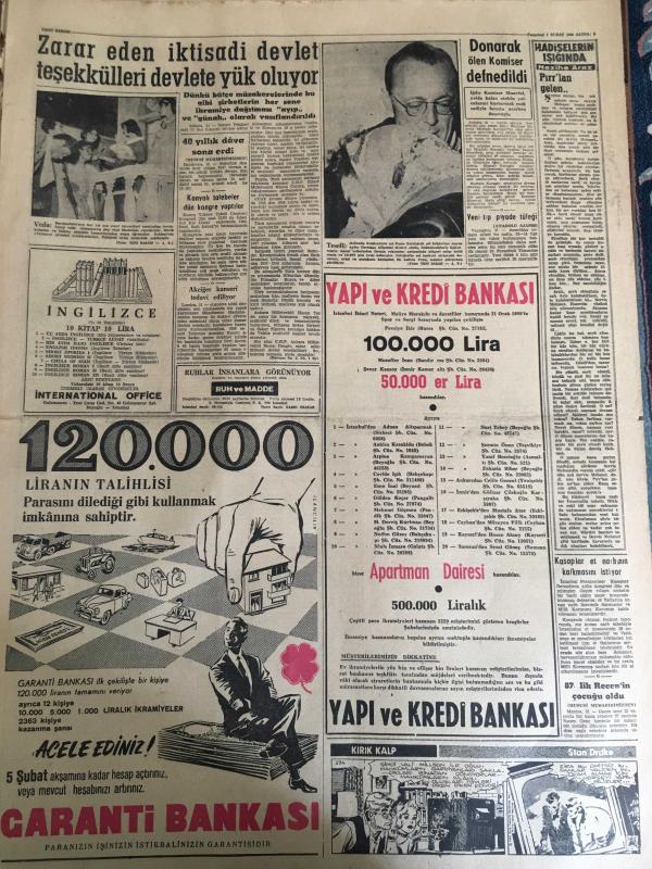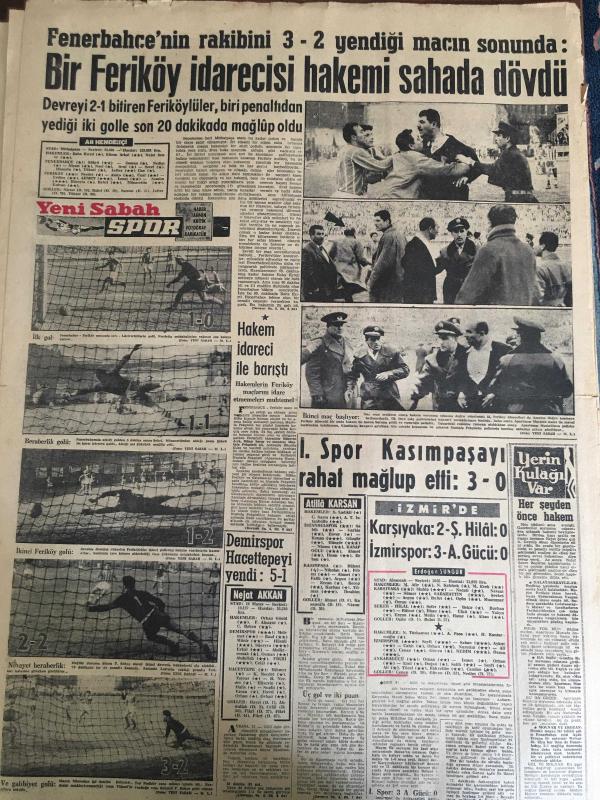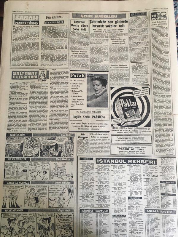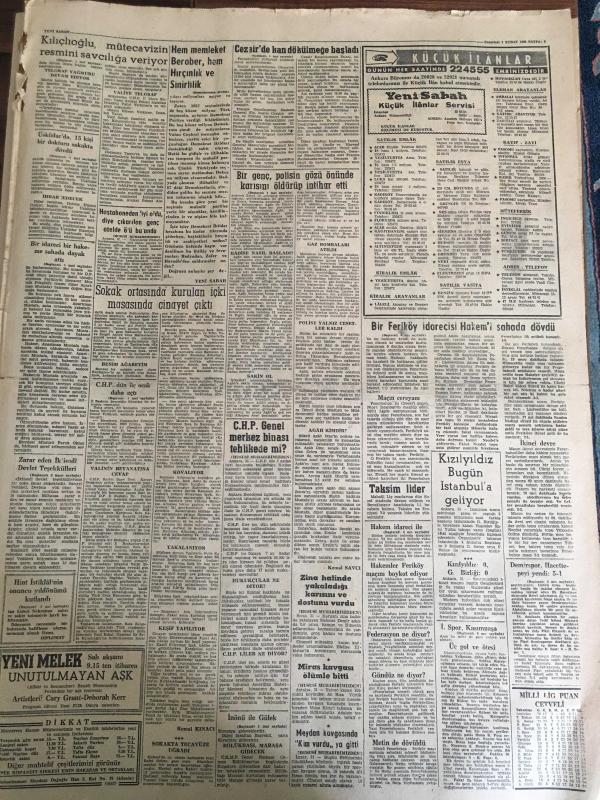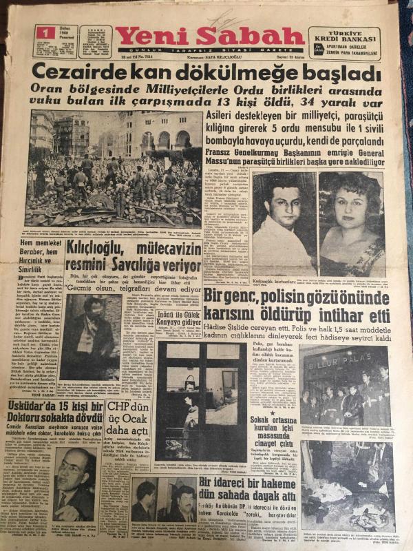 YENİ SABAH GAZETESİ 1 ŞUBAT 1960 YIL :22 SAYI :7514--Cezayir de kan dökülmeye başladı: Oran bölgesinde Milliyetçilerle Ordu birlikleri arasında vuku bulan ilk çarpışmada 13 kişi öldü ,34 yaralı var ---Kılıçlıoğlu mütecavizin resmini savcılığa veriyor --Bir genç ,polisin gözü önünde karısını öldürüp intihar etti --Üsküdar da 15 kişi bir doktoru sokakta dövdü --Sokak ortasına kurulan içki masasında cinayet çıktı --Bir idareci bir hakeme dün sahada dayak attı --Bazı kitaplar :Siyavuşgil --İstanbul Rehberi --Zarar eden iktisadi devlet teşekkülleri devlete yük oluyor --Donarak ölen komiser defnedildi ---CHP Genel Merkez Binası Tehlikede Mi ?--Sokak ortasında kurulan içki masasına cinayet çıktı ---Fenerbahçe nin rakibi 3-2 yendiği maçın sonunda :Bir Feriköy idarecisi hakemi sahada dövdü ---İ.Spor Kasımpaşa yı rahat mağlup etti :3-0--Demirspor Hacettepe yi yendi :5-1-- Yıpranma, sararmalar, kupon kesiği ve yırtılmalar zamana bağlı olarak görülebilir.