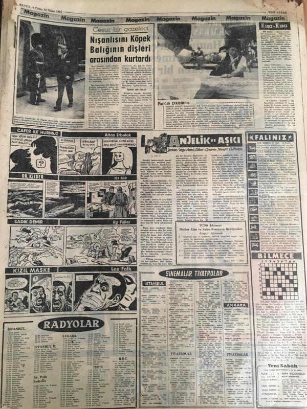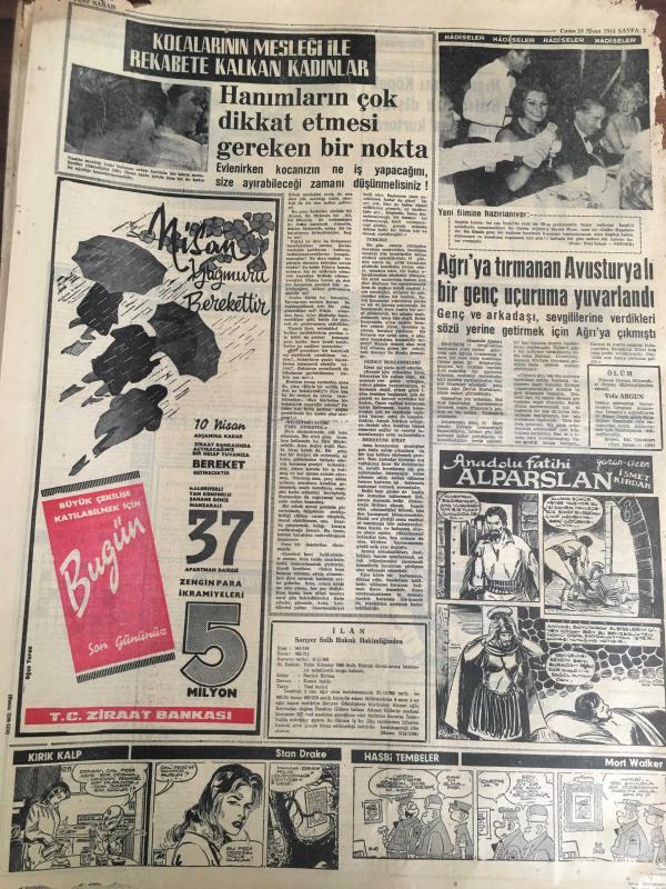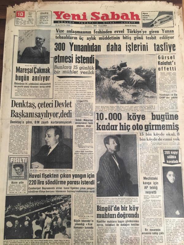YENİ SABAH GAZETESİ 10 NİSAN 1964 YIL :26 SAYI :9008---300 Yunanlıdan daha işlerini tasfiye etmesi istendi --Mareşal Çakmak Bugün Anılıyor --Denktaş ,çeteci Devlet Başkanı Sayılır Dedi ---10.000 köye bugüne kadar hiç oto girmemiş ---Gürsel Kalafatı Affetti ---Havai Fişekten Çıkan Yangın İçin 220 Lira Söndürme Parası İstendi --Bingöl de bir köy muhtarı doğrandı ---Boş Zamanlar :Siyavuşgil --Churcill 'in geçirdiği büyük tehlike ---Ağrı ya tırmanan Avusturyalı bir genç uçuruma yuvarlandı ---Nişanlısının Köpek Balığının Dişleri Arasından Kurtardı ---Karar çıktı :Asker futbolcular takımlarında oynayabilecek ---Beşiktaş , bu sabah Başkente gidiyor ---Kadri ve Yılmaz Merkez Ceza Heyetine Verildi ---Ordu Takımımızın 72. Maçı İran la -- Yıpranma, sararmalar, kupon kesiği ve yırtılmalar zamana bağlı olarak görülebilir.