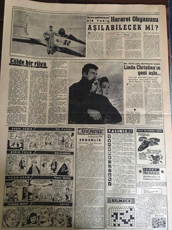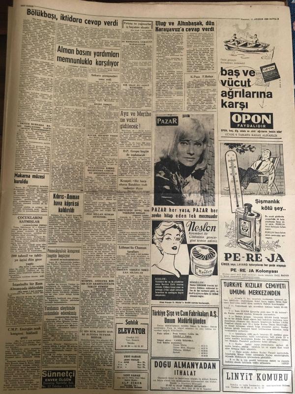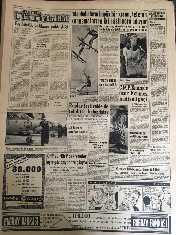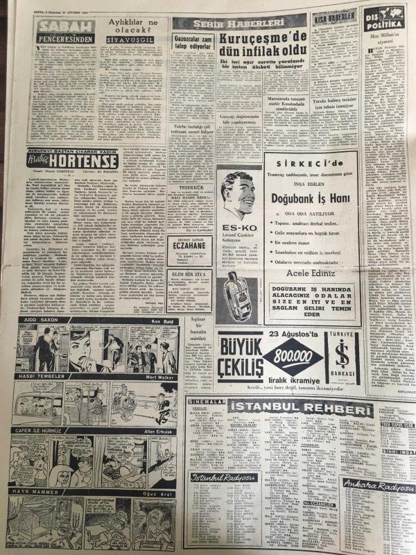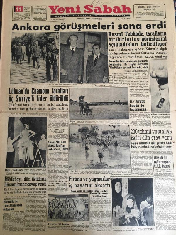 YENİ SABAH GAZETESİ 11 AĞUSTOS 1958 YIL :21 SAYI :6980--Ankara görüşmeleri sona erdi : Resmi tebliğinde ,tarafların birbirlerine görüşlerini açıkladıkları belirtiliyor --Lübnan da Chammoun taraftarı üç Suriyeli lider öldürüldü --DP Grubu bugün de toplanacak --Krutçef bir harp olursa ,Batılıları mahvederiz diyor ---Bölükbaşı ,dün iktidarın hücumlarına cevap verdi --200 Tahmil ve tahliye işçisi dün grev yaptı ---Fırtına ve yağmurlar iş hayatını aksattı ---Aylıklar ne olacak :Siyavuşgil --İstanbul Rehberi ---İstanbulluların büyük bir kısmı ,telefon konuşmalarına iki misli para ödüyor --CMP Emirgan Ocak Kongresi Hadiseli Geçti ---Ruslar festivalde tehditte bulundular ---CHP ve Hür P sekreterleri aynı gün seyahati çıkıyor ---K.Gümrük :3 Merinos :1--Fenerbahçe yeni sezonu altı golle açtı --I.Spor ,Beylerbeyi ni zor mağlup etti :1-0--K.Paşa ,Fenerbahçe genç takımı karşısında terledi :5-4--Uluğ ve Altınbaşak dün K.Yavuz a cevap verdiler --- Yıpranma, sararmalar, kupon kesiği ve yırtılmalar zamana bağlı olarak görülebilir.
