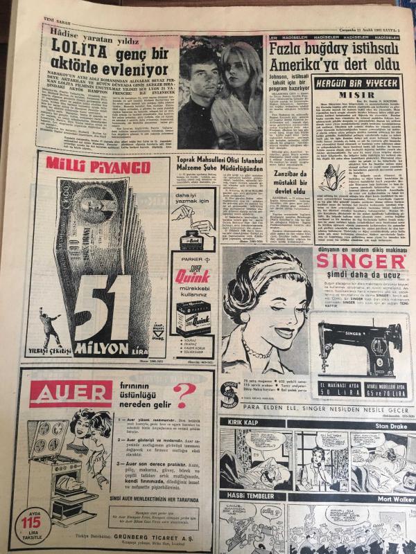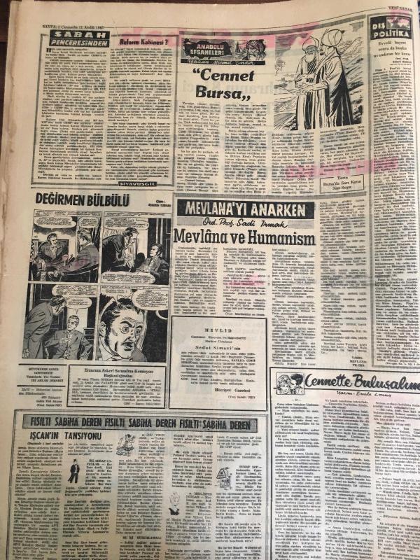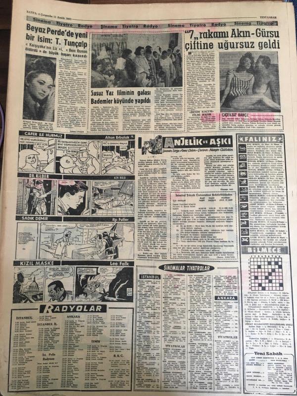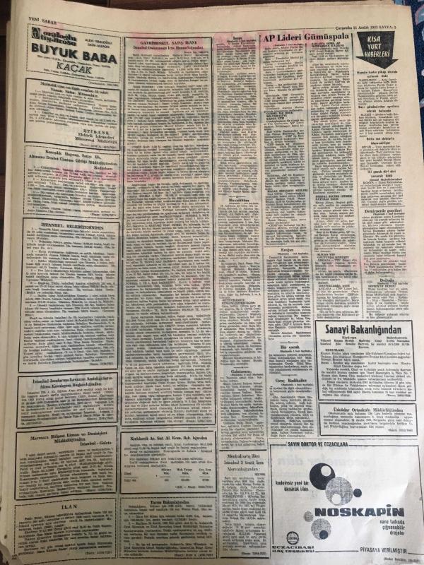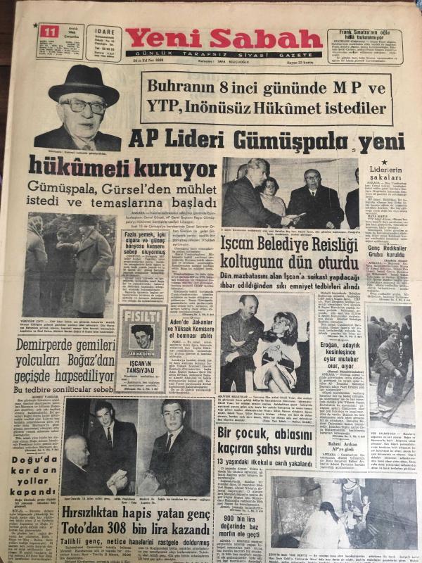 YENİ SABAH GAZETESİ 11 ARALIK 1963 YIL :26 SAYI :8889---Buhranın 8. gününde MP ve YTP ,İnönüsüz hükümet istediler --Demirperde gemileri yolcular boğazdan geçiş de hapsediliyor --İşcan Belediye Reisliği koltuğuna dün oturdu --Bir çocuk ablasını kaçıran şahsı vurdu ---Hırsızlıktan hapis yatan genç Toto dan 308 bin lira kazandı ---Aden de bakanlar yüksek komisere el bombası atıldı --Doğu da kardan yollar kapandı --900 bin lira değerinde baz morfin ele geçti ---Reform Kabinesi ? : Siyavuşgil --Fazla buğday istihsali Amerika ya dert oldu ---Zanzibar da müstakil bir devlet oldu --Beyaz perde de yeni bir isim :T.Tunçalıp --7 rakamı Akın -Gürsu çiftine uğursuz geldi ---Fenerbahçe-Lınfıeld --Galatasaray -Zurich üçüncü defa karşı karşıya --Güreş kampında son seçmeler dün yapıldı --Beşiktaş da Usuuğlu yine ceza yağdırdı ---Ali Uras da istifa sebeplerini dün açıkladı -- Yıpranma, sararmalar, kupon kesiği ve yırtılmalar zamana bağlı olarak görülebilir.