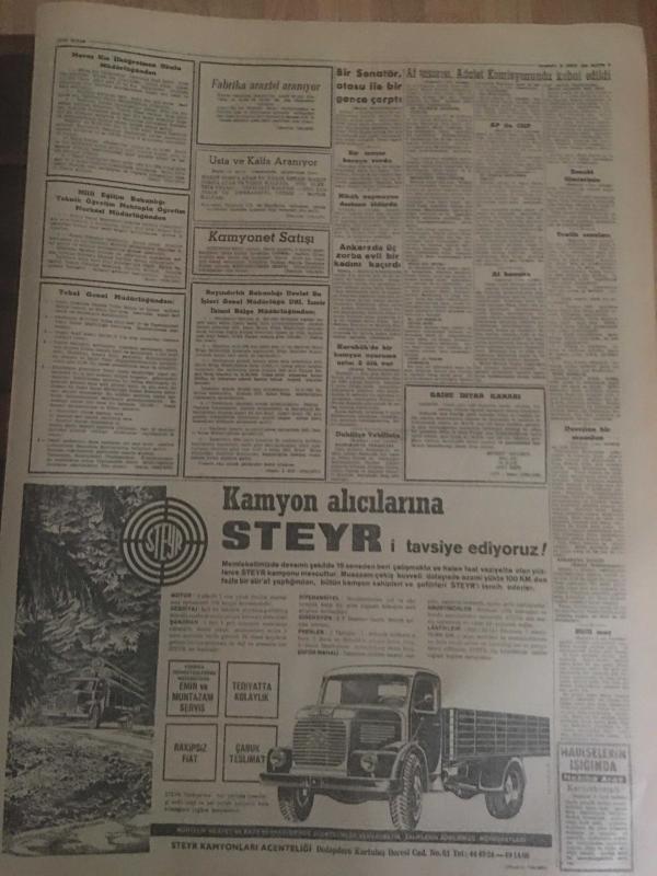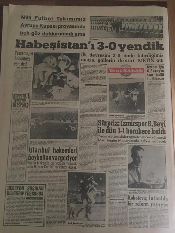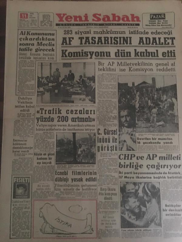YENİ SABAH GAZETESİ 11 EKİM 1962 YIL :25 SAYI :8470---Af kanunu çıkardıktan sonra Meclis tatile girecek ---Af Tasarısını Adalet Komisyonu Dün Kabul Etti ---Trafik cezaları yüzde 200 artmalı --C.Gürsel İnönü ile Görüştü --Ecnebi fillerinin düblajı yasak edildi --CHP ve AP milleti birliğe çağırıyor---Huzura Doğru :Siyavuşgil ---Boğazda eğlenmeye giderken can verdi --Ceyhan da iki kız taksi Adana 'ya kaçırıldı ---Atomla çalışan otolar yapılacak --Habeşistan 'ı 3-0 yendik --Sürpriz :İzmir spor B.Beyi ile dün 1-1 berabere kaldı ---İstanbul hakemleri boykottan vazgeçiyor --Kokotoviç futbolda bir reform yapıyor -- Yıpranma, sararmalar, kupon kesiği ve yırtılmalar zamana bağlı olarak görülebilir.