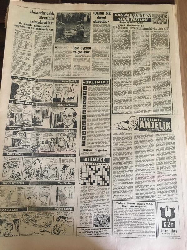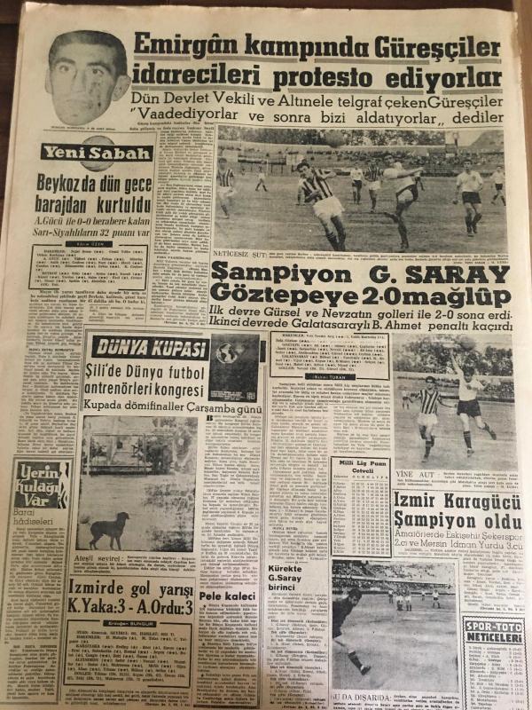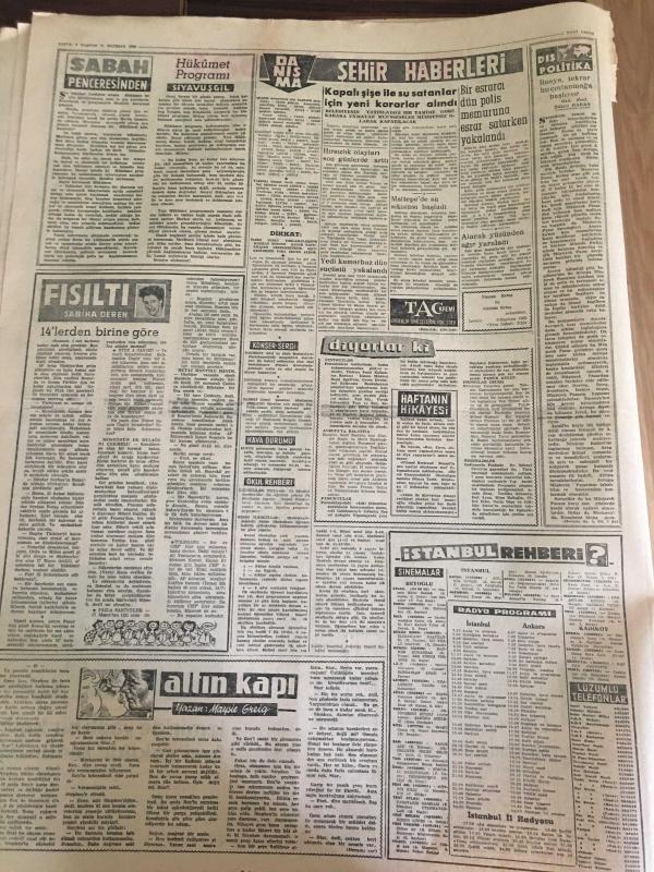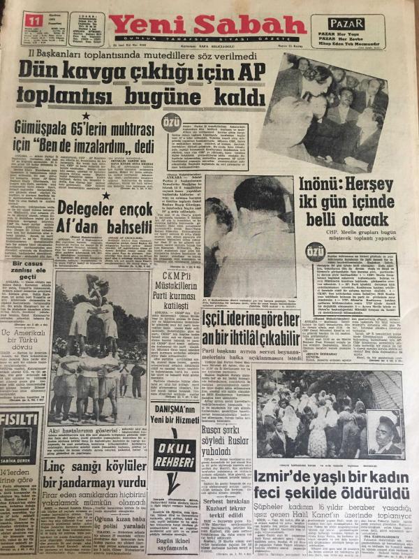 YENİ SABAH GAZETESİ 11 HAZİRAN 1962 YIL :25 SAYI :8348--Dün kavga çıktığı için AP toplantısı bugüne kaldı --Gümüşpala 65 'lerin muhtırası için bende imzalarım dedi --Delegeler en çok Af dan bahsetti --İnönü :Herşey iki gün içinde belli olacak --İşçi Liderlerine Göre Her An Bir İhtilal Çıkabilir --Linç sanığı köylüler bir jandarmayı vurdu --İzmir de Yaşlı Bir Kadın Feci Şekilde Öldürüldü --Hükümet Programı :Siyavuşgil --İnsanoğlu 1968 'de Ay 'a Gidecek ---Dolandırıcılık aleminin Aristokları bu alanda şampiyonluk mertebesini kazananlarda var ---Emirgan Kampında Güreşçiler İdarecileri Protesto Ediyorlar --Şampiyon Galatasaray Göztepe 2-0 Mağlup ---K.Yaka :3 -A.Ordu :3 --İzmir Karagücü Şampiyon Oldu -- Yıpranma, sararmalar, kupon kesiği ve yırtılmalar zamana bağlı olarak görülebilir.