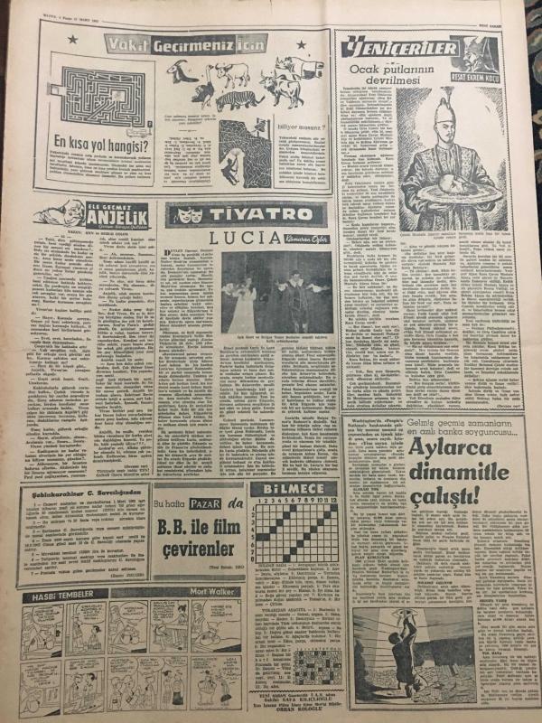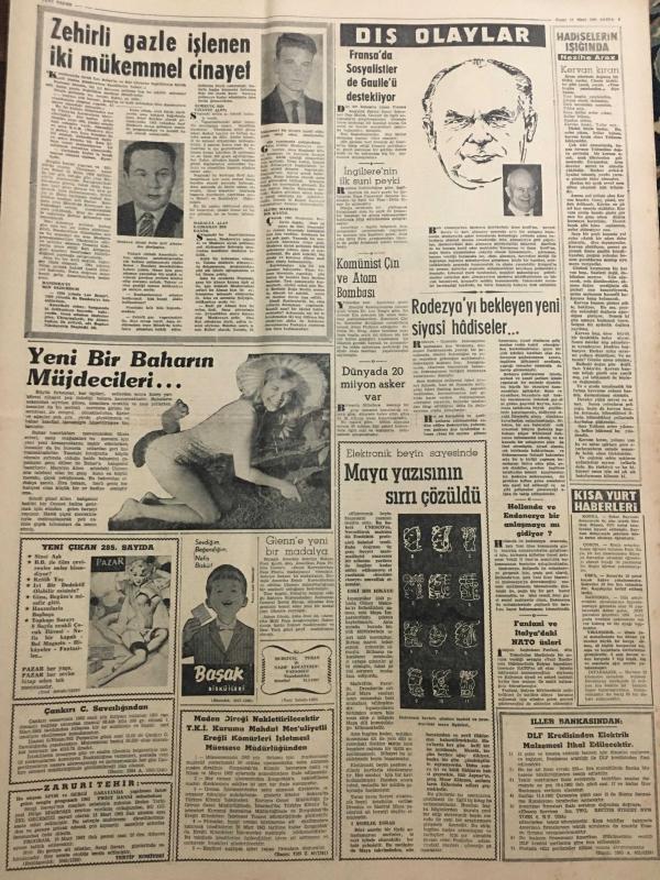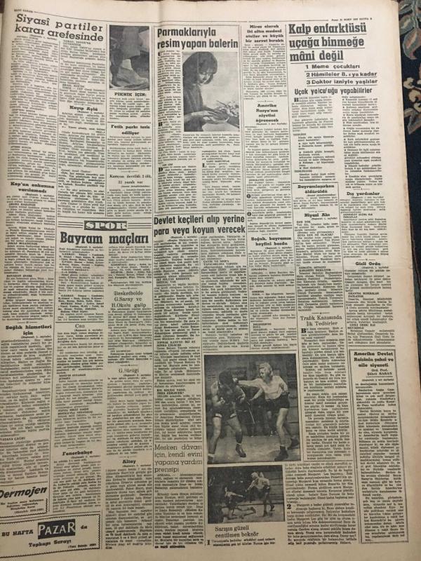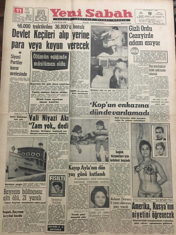 YENİ SABAH GAZETESİ 11 MART 1962 YIL :24 SAYI :8259--Devlet Keçileri alıp yerine para veya koyun verecek --Vali Niyazi Akı Zam Yok Dedi ---Gizli Ordu Cezayir de Adam Asıyor ---Kop un enkazına dün de varılamadı --Kayıp Ayla nın dün yaş günü kutlandı --Bayram bilançosu :Altı ölü ,21 yaralı ---Amerika ,Rusya nın niyetini öğrenecek --Sağlık hizmetleri için tatbikat başladı --Hasbi Beyin Bayramı : Siyavuşgil ---Şehrimizden yaş meyve ihracatı artırılacak ---Tiyatrolar ,Radyo Programları ---Dış Olaylar : Fransa da Sosyalistler De Gaulle ü Destekliyor --Rodezya yı bekleyen yeni siyasi hadiseler ---Komünist Çin ve Atom Bombası ---Fenerbahçe ,D.Spor u 3-1 mağlup edebildi --G.Birliği ,Feriköy ü 2. Devre Yendi :2-1---Altay 2 -Şekerhilal 1 ,A.Gücü 4 -Karşıyaka 0--Can Roma ya karşı Prestijini oynuyor --Bayram maçları --Dış yardımlar hibe şeklinde olacak --Adalet Divanı 2 Yeni Davaya Gün Verdi ---Liseli bir genç 18 gündür kayıp ---Siyasi Partiler Karar Arifesinde --- Yıpranma, sararmalar, kupon kesiği ve yırtılmalar zamana bağlı olarak görülebilir.
