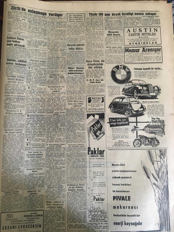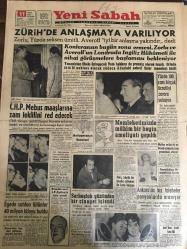 YENİ SABAH GAZETESİ 11 ŞUBAT 1959 YIL :21 SAYI :7164--Zürih de anlaşmaya varılıyor --CHP Mebus maaşlarına zam teklifini red edecek --Memleketimde mühim bir beyin ameliyatı yapıldı ---Ege de satılan tütünler 40 milyon kiloyu buldu ---Yüzde 100 zam birçok üreticiyi zarara sokuyor --Ankara da kız talebeler pavyonlarda aranıyor ---Cesetli sokaklar :Siyavuşgil ---İki memur vakıflara ait bir binayı satmış --İstanbul Rehberi ---Dz .Bankası izdihamı önleyecek halde değil ---Galatasaray la Karagümrük lig de son defa karşılaşacak ---Fenerbahçe ve Galatasaray yüzde 60 da ısrar ediyor --Beşiktaş ta üç futbolcu için tahkikat komitesi kuruldu --Jon Konrads ın yeni bir dünya rekoru :400 m.4.19--- adlı eser, Kitap > Süreli Yayınlar > Gazeteler > Türkiye > Genel > Günlük kategorisinde İkinci El olarak satıştadır.