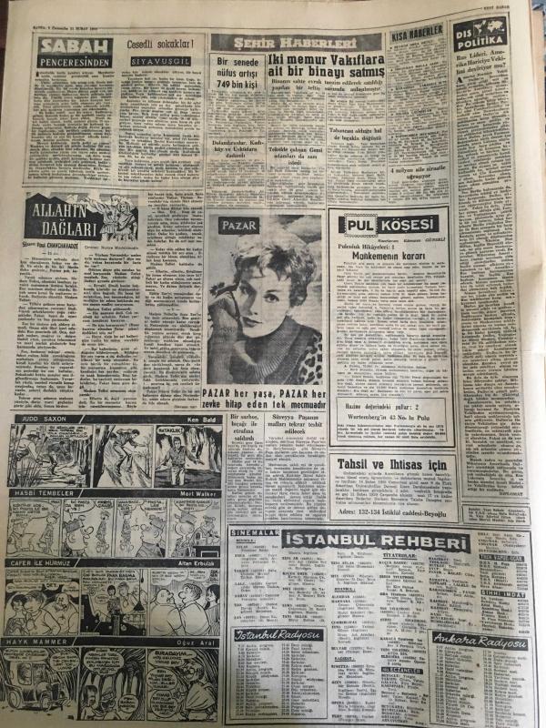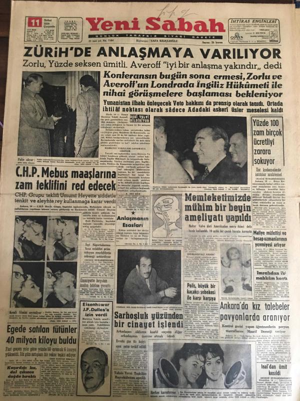 YENİ SABAH GAZETESİ 11 ŞUBAT 1959 YIL :21 SAYI :7164--Zürih de anlaşmaya varılıyor --CHP Mebus maaşlarına zam teklifini red edecek --Memleketimde mühim bir beyin ameliyatı yapıldı ---Ege de satılan tütünler 40 milyon kiloyu buldu ---Yüzde 100 zam birçok üreticiyi zarara sokuyor --Ankara da kız talebeler pavyonlarda aranıyor ---Cesetli sokaklar :Siyavuşgil ---İki memur vakıflara ait bir binayı satmış --İstanbul Rehberi ---Dz .Bankası izdihamı önleyecek halde değil ---Galatasaray la Karagümrük lig de son defa karşılaşacak ---Fenerbahçe ve Galatasaray yüzde 60 da ısrar ediyor --Beşiktaş ta üç futbolcu için tahkikat komitesi kuruldu --Jon Konrads ın yeni bir dünya rekoru :400 m.4.19--- Yıpranma, sararmalar, kupon kesiği ve yırtılmalar zamana bağlı olarak görülebilir.