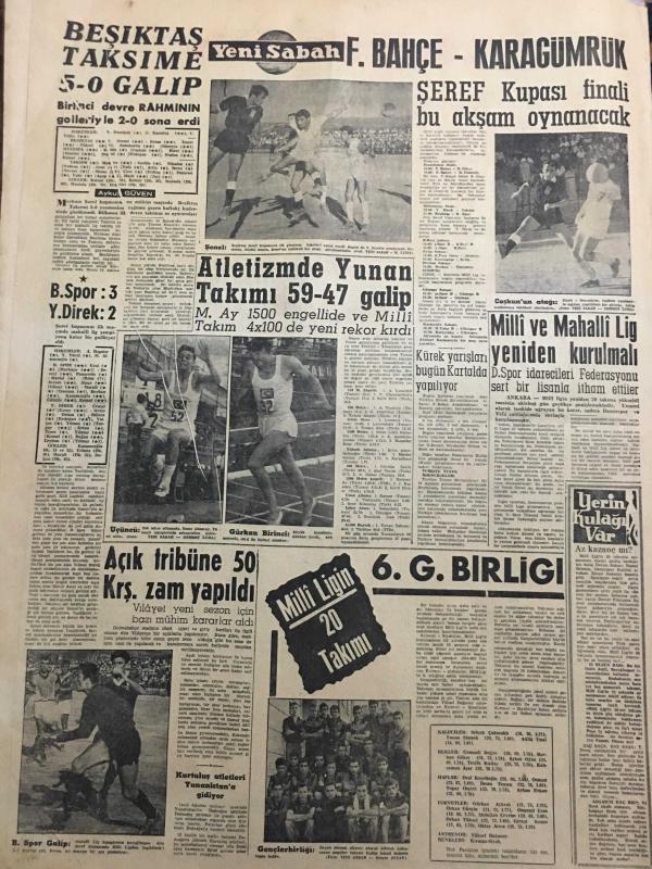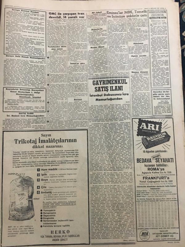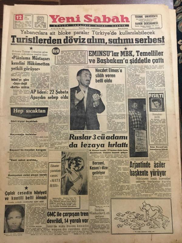 YENİ SABAH GAZETESİ 12 AĞUSTOS 1962 YIL :25 SAYI :8410---Turistlerden döviz alım ,satımı serbest ---Planlama Müsteşarı Kendini Hükümetten Yetkili Görüyor --EMİNSU lar MBK ,Temelliler ve Başbakan a şiddetle çattı --Necdet Elmas a silah veren belli oldu ---Ruslar 3. adamı da fezaya fırlattı ---Çıplak cesedin hüviyeti ve kaatili belli olmadı --Arjantin de asiler başkente yürüyor --GMC ile çarpışan tren devrildi ,14 yaralı var --Barzani Kasım ı dize getiriyor ---Kalın Kafalı Hasbi bey :Siyavuşgil --Bir şahıs 4 çocuğunun gözü önünde boğuldu ---Afrika Devletleri Konferansı Kapandı --Bayan Kennedy Eğleniyor ---Beşiktaş Taksime 5-0 Galip --B.Spor :3 Y.Direk :2 ---Atletizmde Yunan Takımı 59-47 Galip --Milli ve Mahalli Lig Yeniden Kurulmalı ---Açık tribüne krş zam yapıldı --Şeref Kupası Finali Bu Akşam Oynanacak ---Komşunun evini ateşe verdi --İnönü ye göre sayı değil kalite mühim ---Türkiye kuduz da 3. geliyor --AP lideri 22 Şubata Apaydın Sebep oldu ---Radyo Programları -- Yıpranma, sararmalar, kupon kesiği ve yırtılmalar zamana bağlı olarak görülebilir.