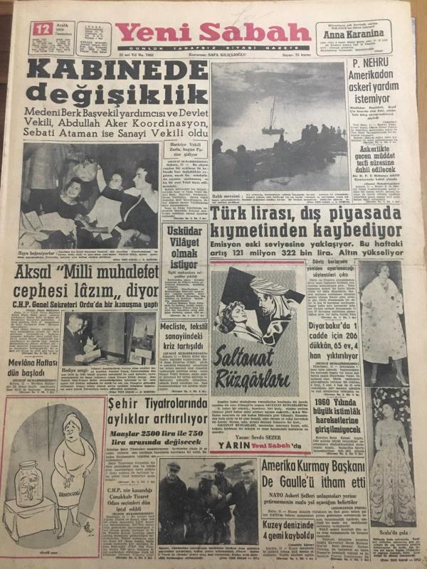 YENİ SABAH GAZETESİ 12 ARALIK 1959 YIL :22 SAYI : 7463---Kabine de değişiklik ---Türk lirası ,dış piyasada kıymetinden kaybediyor ---Aksal Milli muhalefet cephesi lazım diyor ---Şehir Tiyatrolarında aylıklar artırılıyor --1960 Yılında büyük istimlak hareketlerine girişilmeyecek ---Amerika Kurmay Başkanı De Gaulle ü İtham Etti ---Zarar ve kar : Siyavuşgil ---Sinemalar ,Tiyatrolar ,Radyo Programları ---Otomobil getirtme müddeti sona eriyor ---B.Almanya da 49 kızıl tevkif edildi ---Sinema : Hayat Ağacı, O Gece ---Galatasaray ,İzmir de son şansını deniyor ---Fenerbahçe için en büyük tehlike : İsviçre li hakemler ---Güre Galatasaray İdare Heyetinin İstifasını 3 Noktada Topluyor --Molnar ,Fenerbahçe gece antrenman yaptırmak istiyor ---B.Milli Takımı 26 Aralıkta Açıklanak ---Voleybol Avrupa Kupasına Katılıyoruz ---P. Nehru Amerika dan askeri yardım istemiyor --- Yıpranma, sararmalar, kupon kesiği ve yırtılmalar zamana bağlı olarak görülebilir.